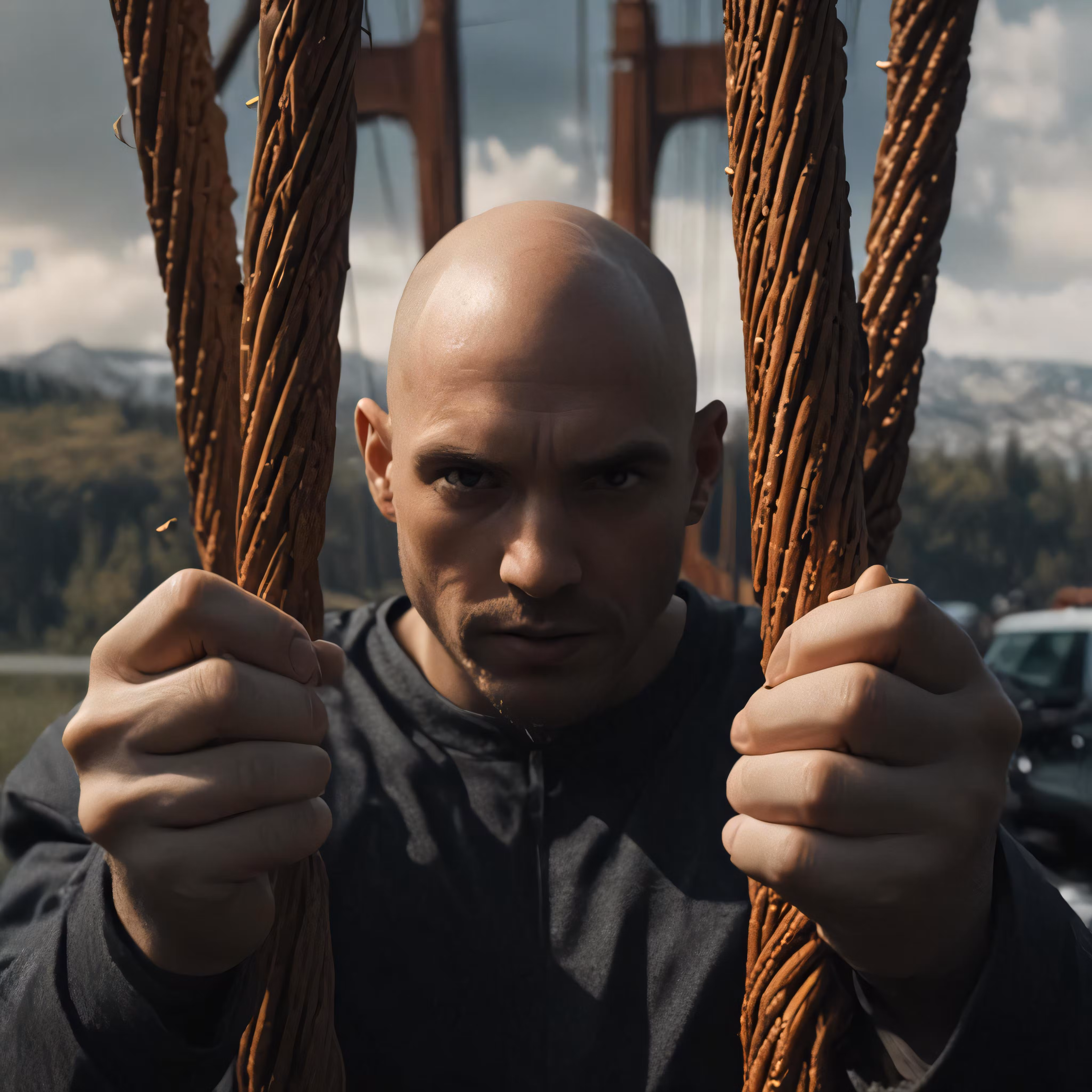 High resolution picture, free to use, a balding man holding ropes next to a bridge