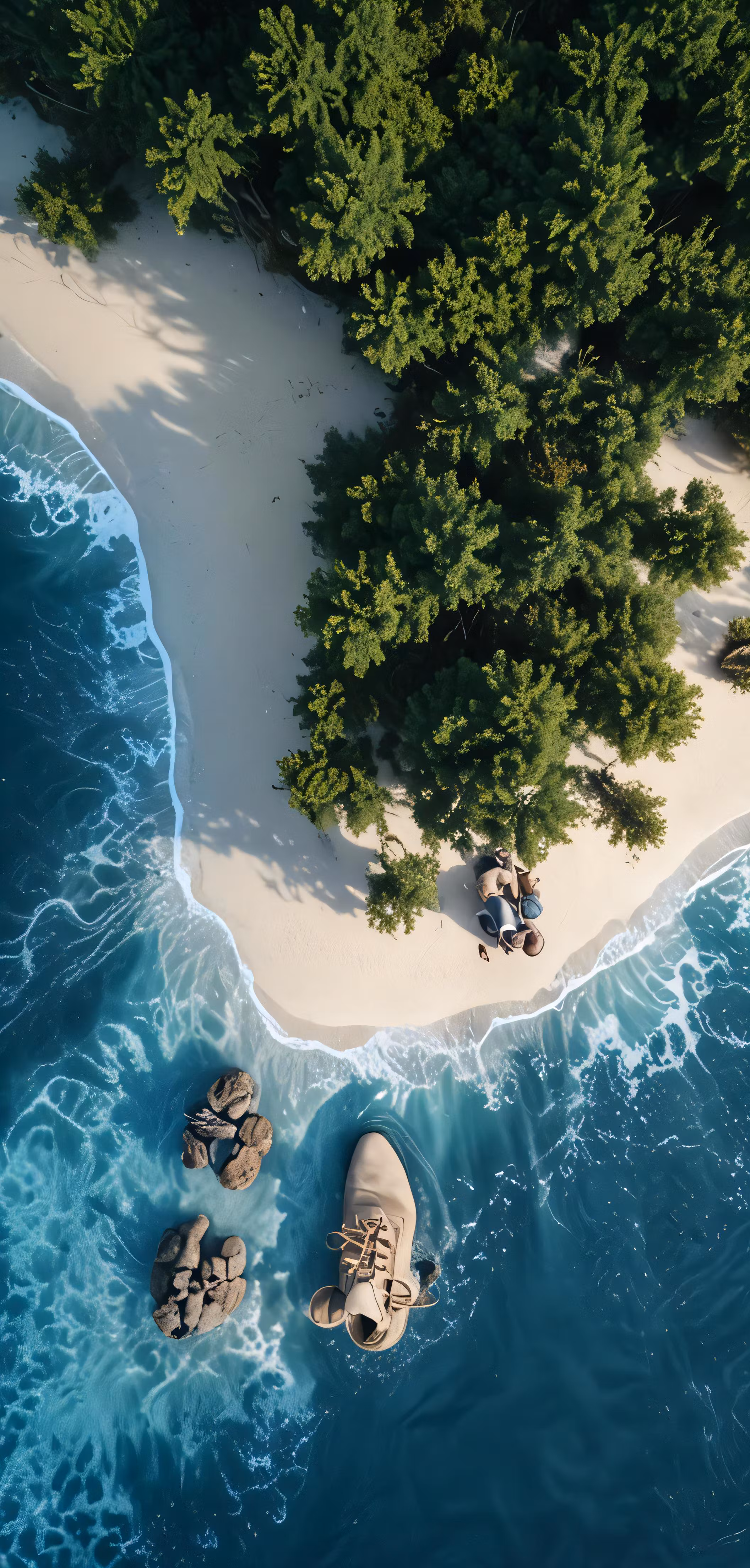 High resolution picture, free to use, a beach with many trees in the middle and blue water