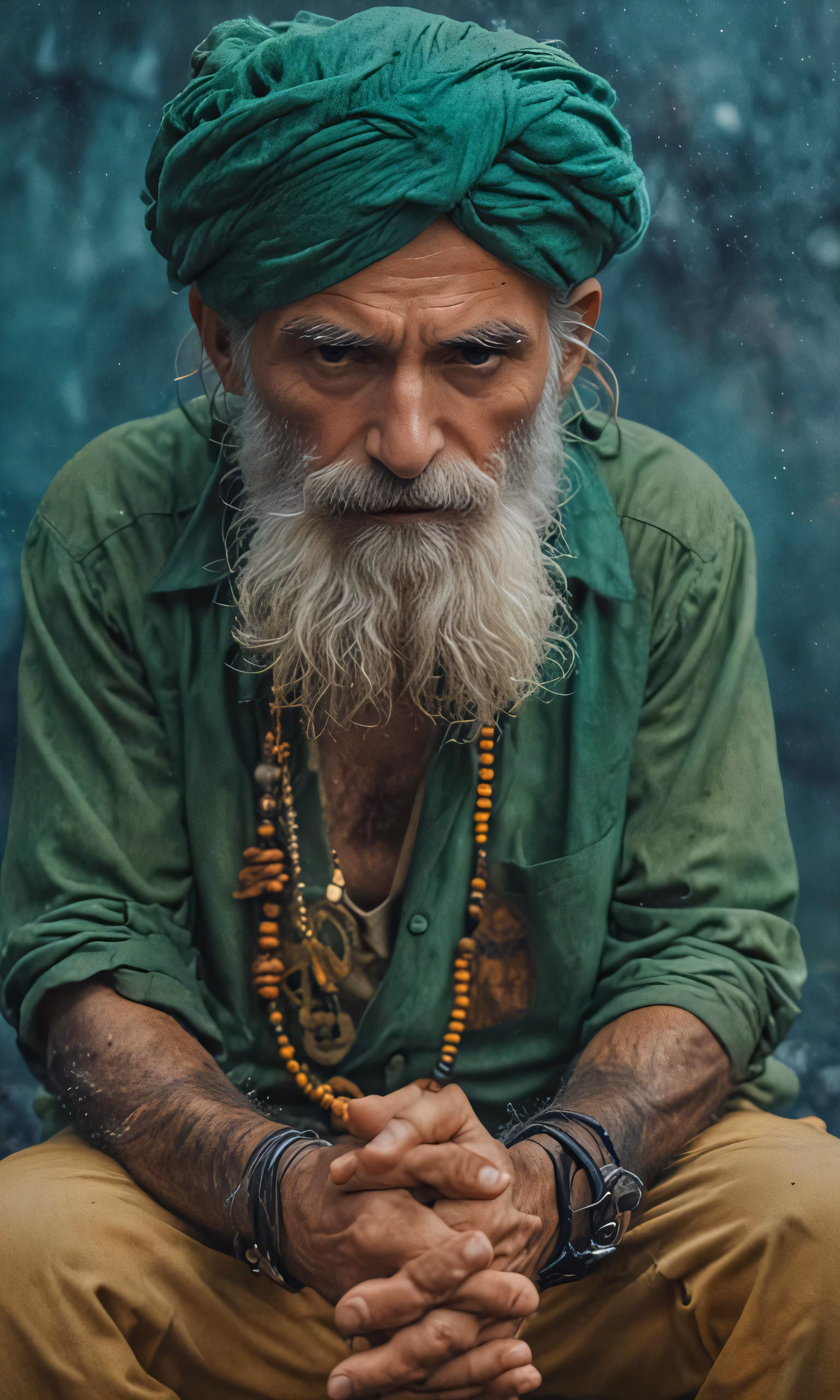 High resolution picture, free to use, a bearded, white   bearded man wearing beads is sitting in front of some rocks