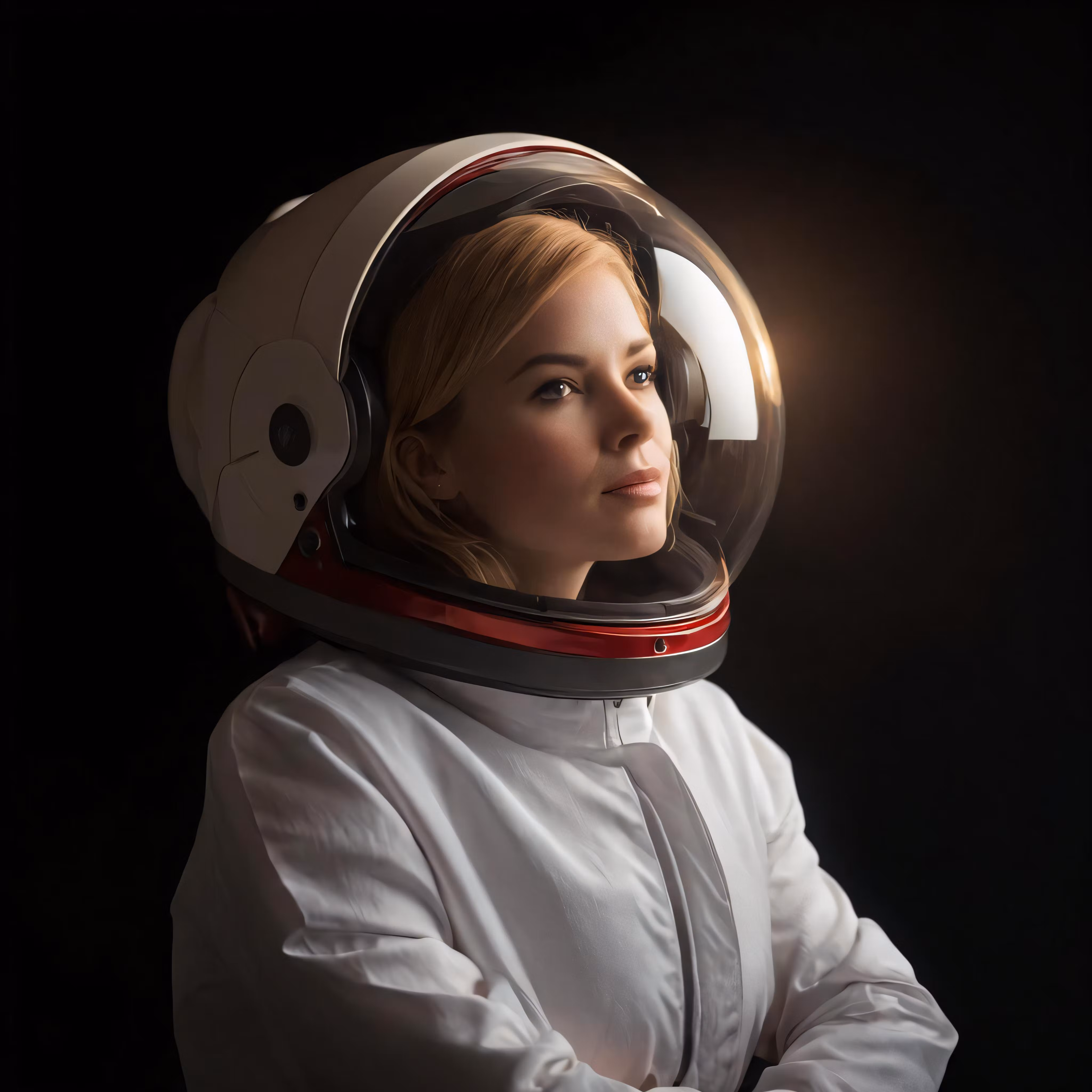 High resolution picture, free to use, a beautiful blonde wearing a white shirt and astronaut suit