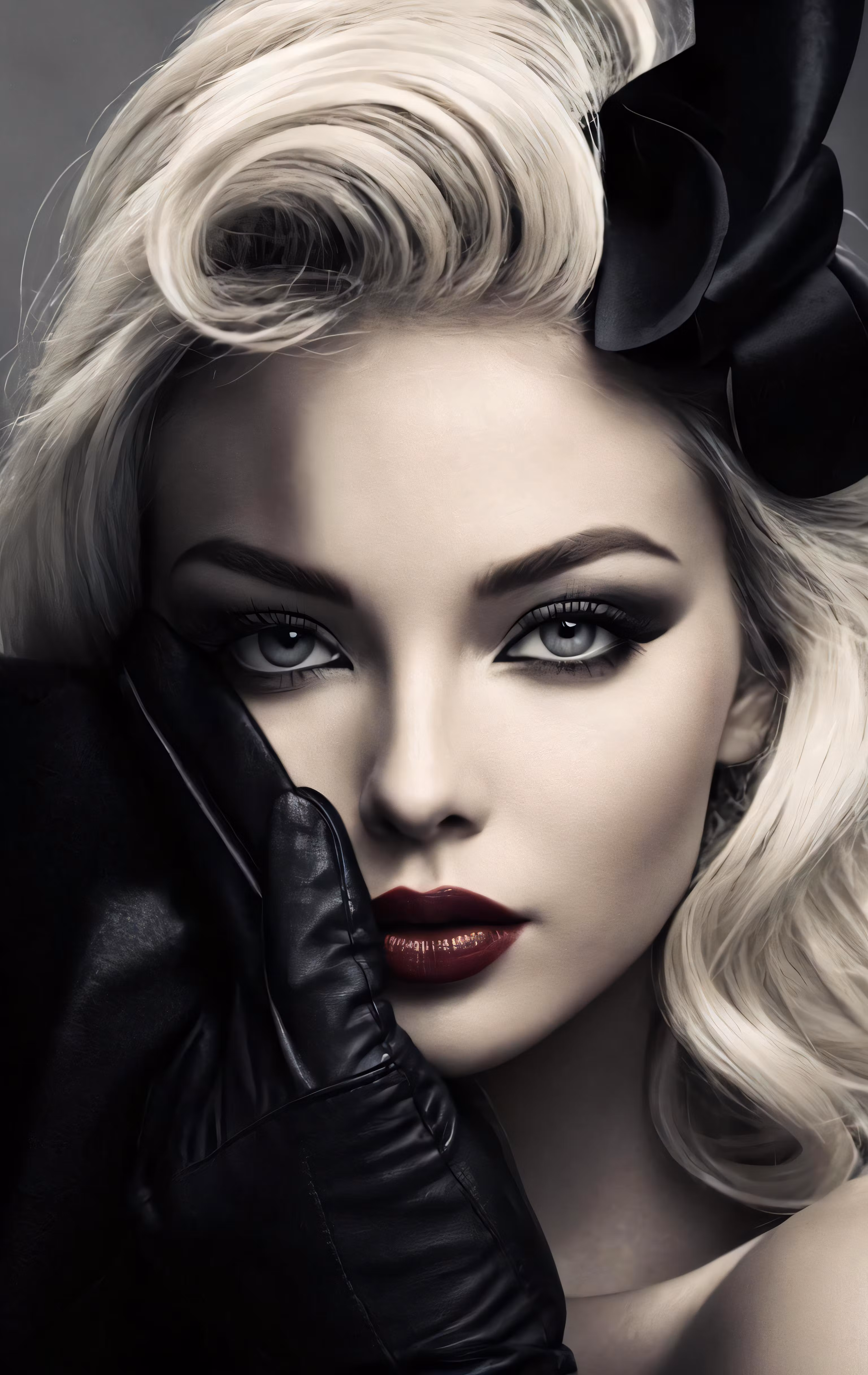 High resolution picture, free to use, a beautiful blonde woman in black gloves holding her hand up to her face