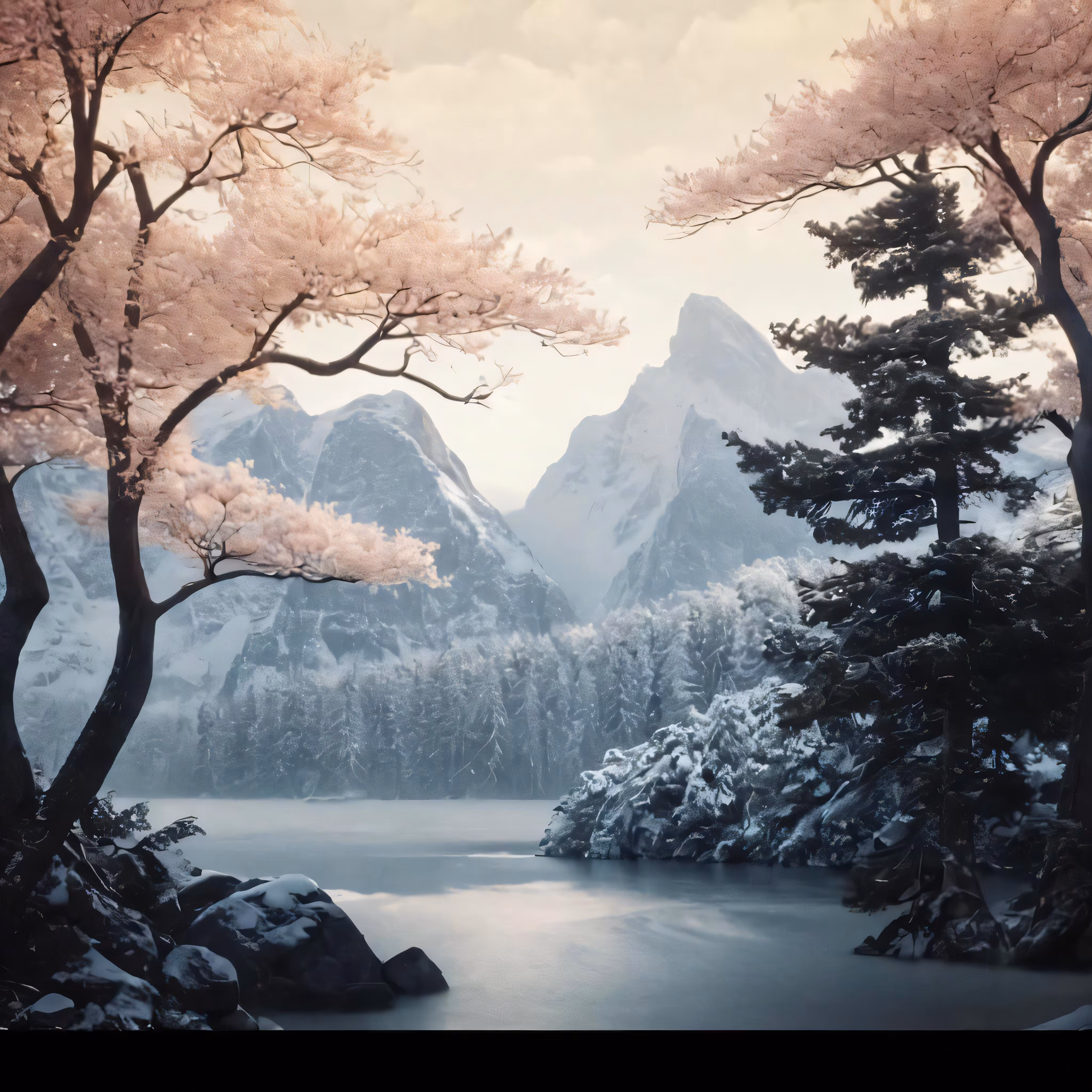 High resolution picture, free to use, a beautiful landscape of a mountain range with a lake surrounded by cherry blossoms