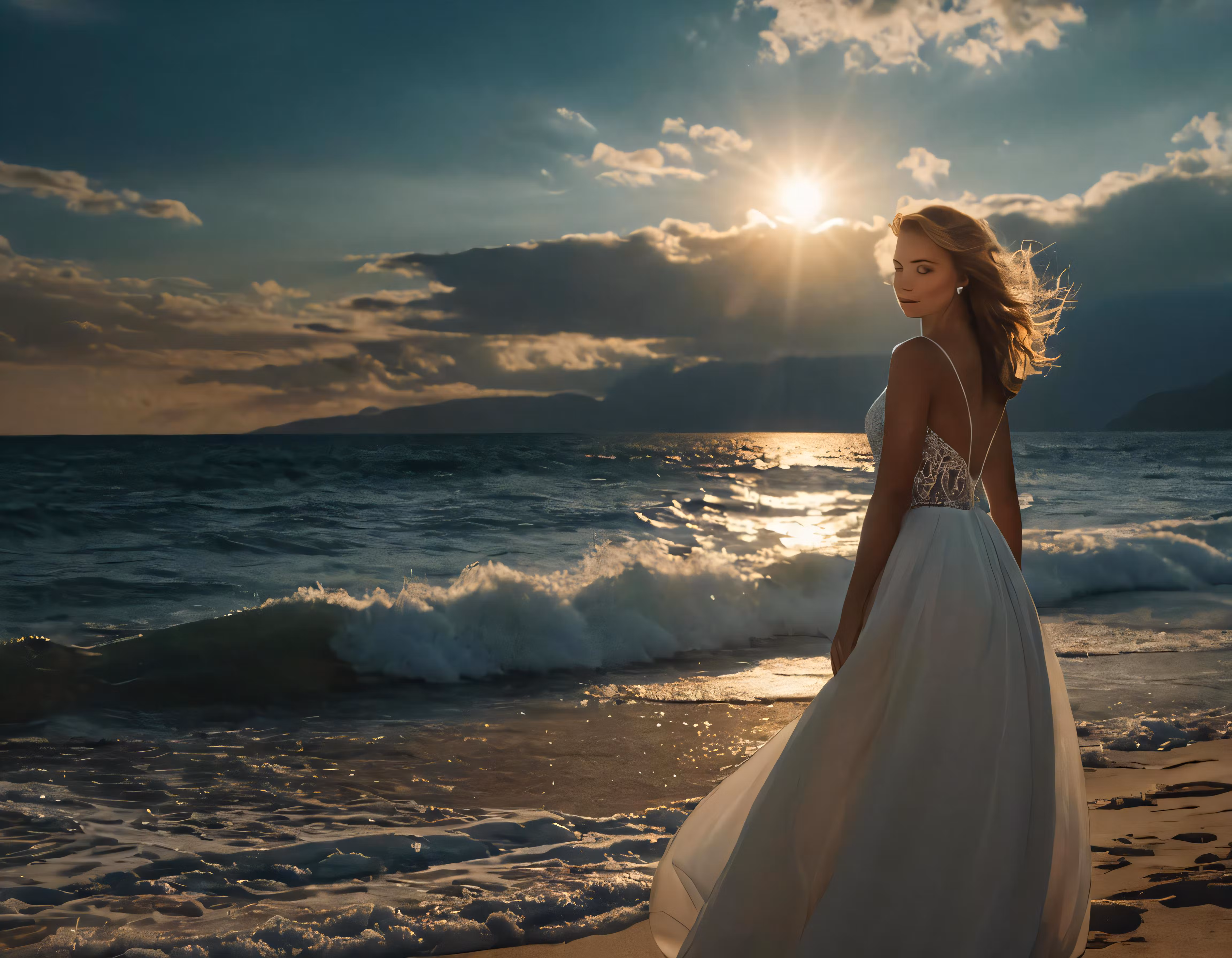 High resolution picture, free to use, a beautiful woman in a white dress standing on the beach
