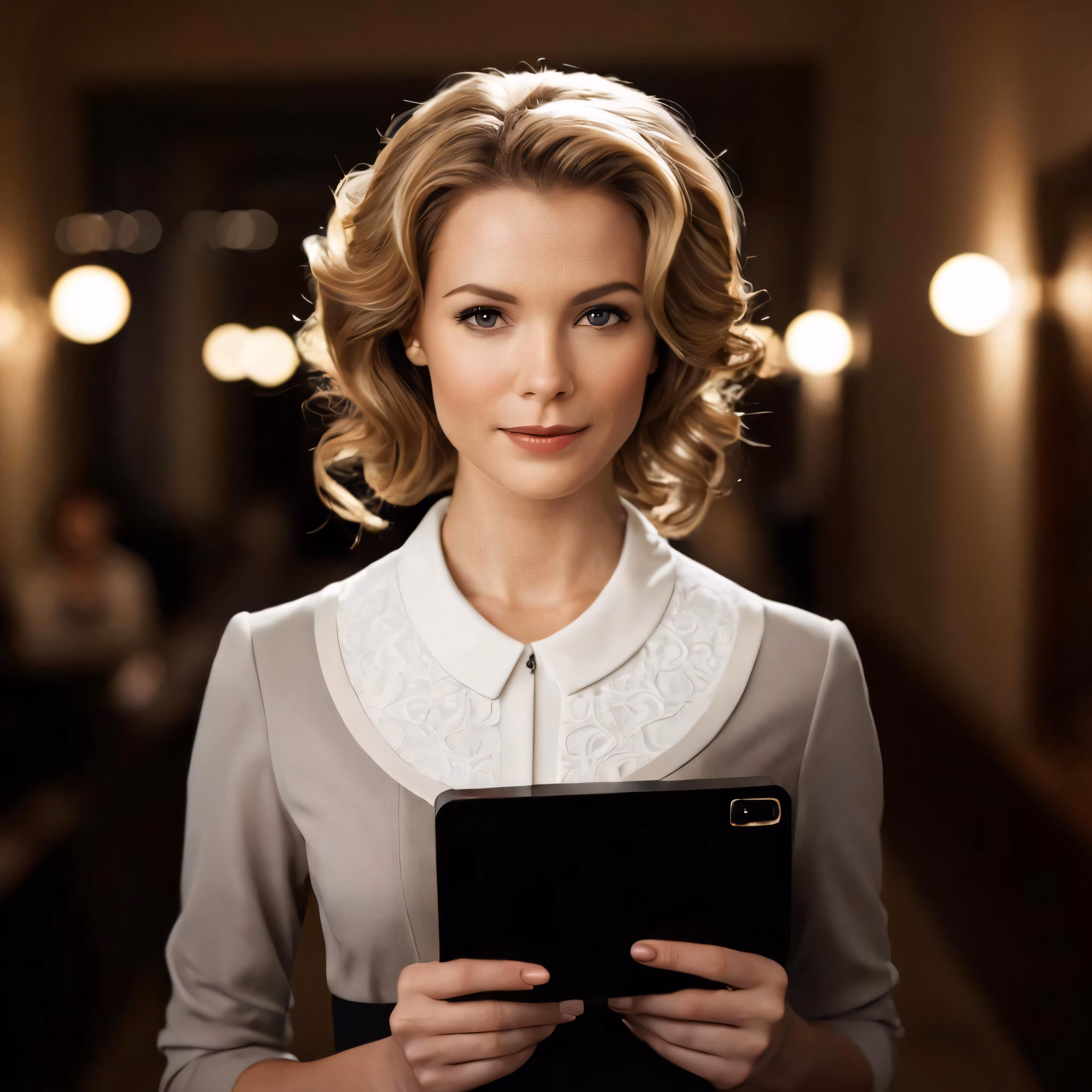 High resolution picture, free to use, a beautiful woman in dress holding and operating a tablet