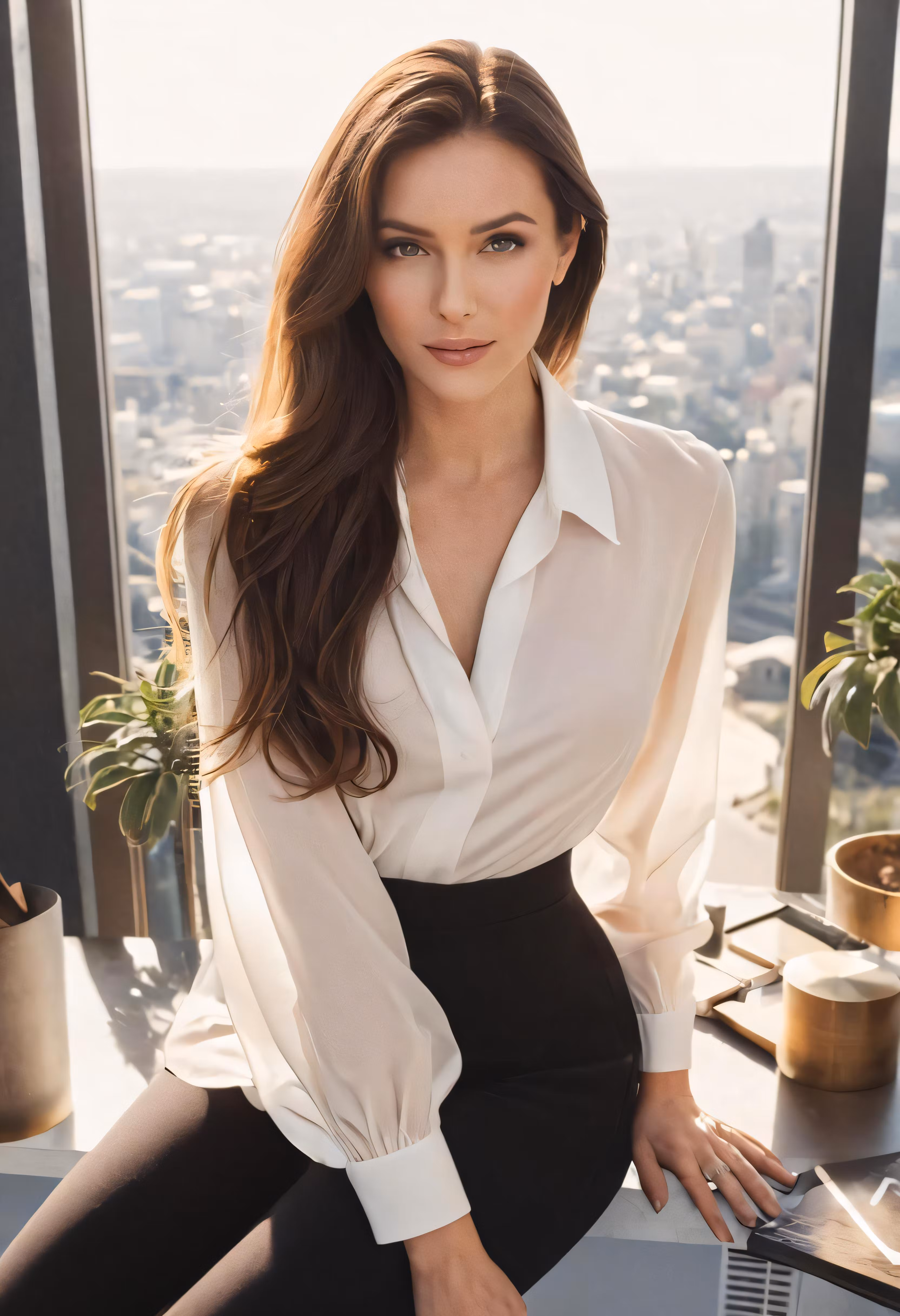 High resolution picture, free to use, a beautiful woman in tight black pants and a white shirt