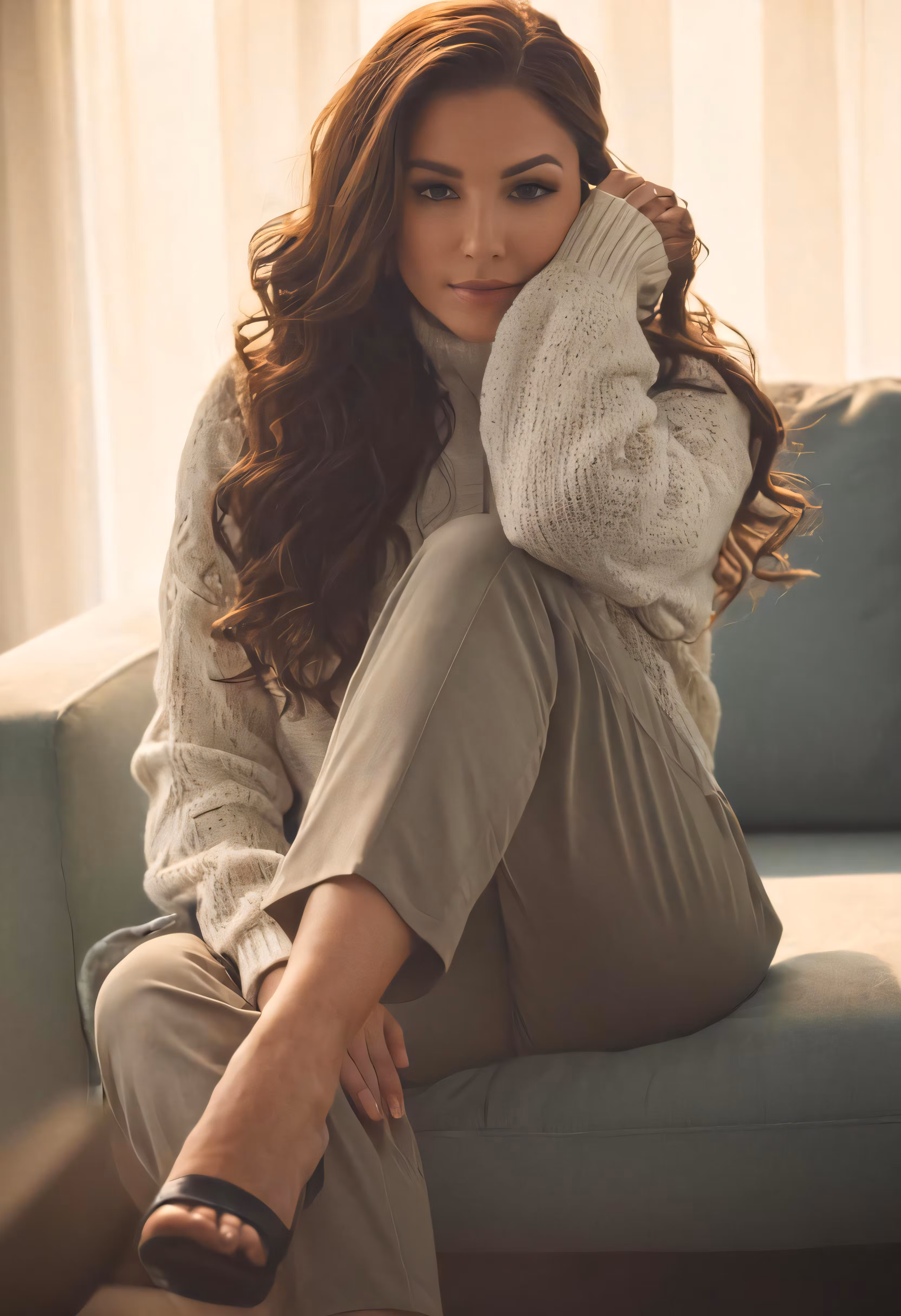 High resolution picture, free to use, a beautiful woman sitting on top of a blue couch