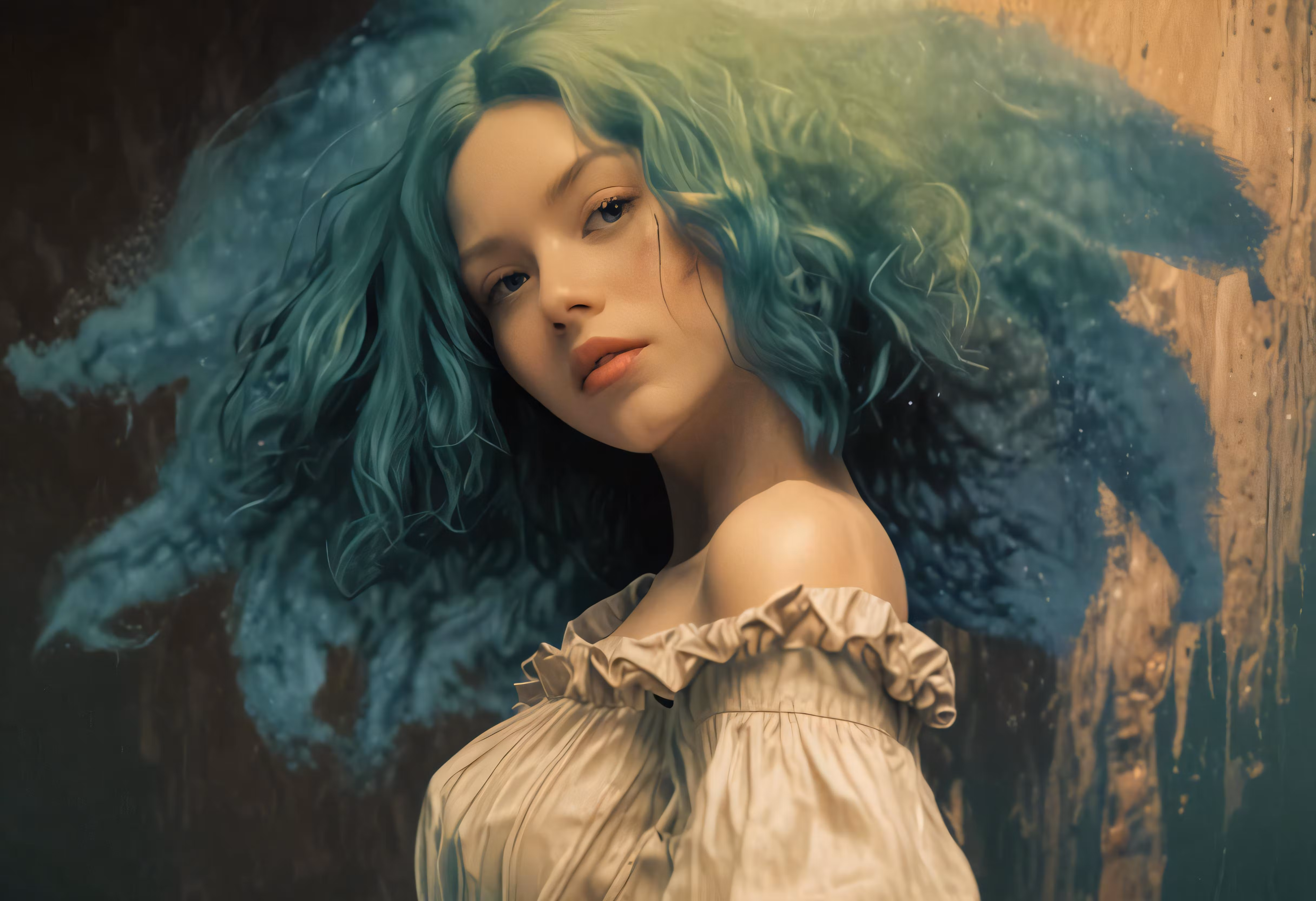 High resolution picture, free to use, a beautiful woman with blue hair wearing a white dress
