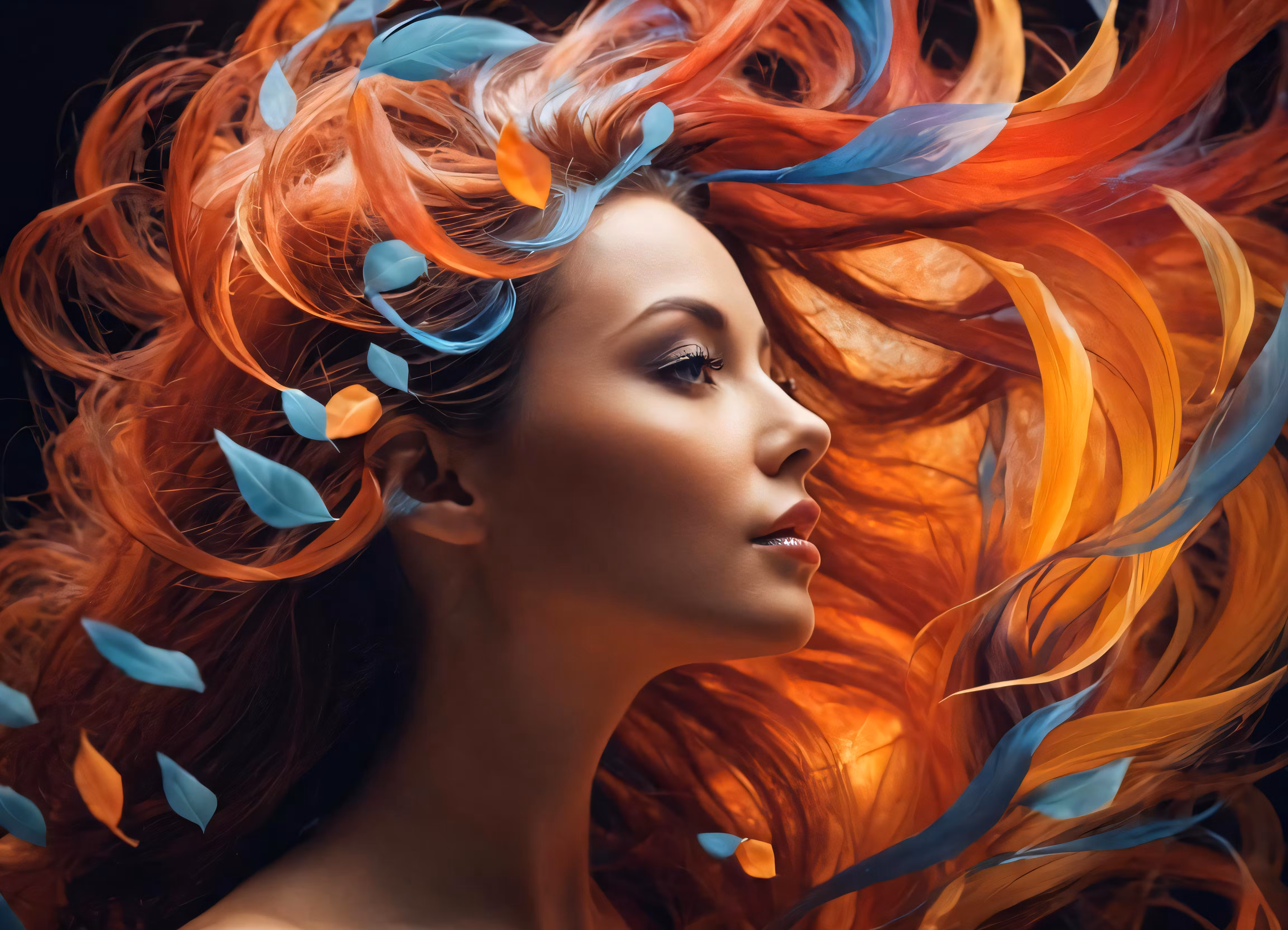 High resolution picture, free to use, a beautiful woman with colorful hair and feathers