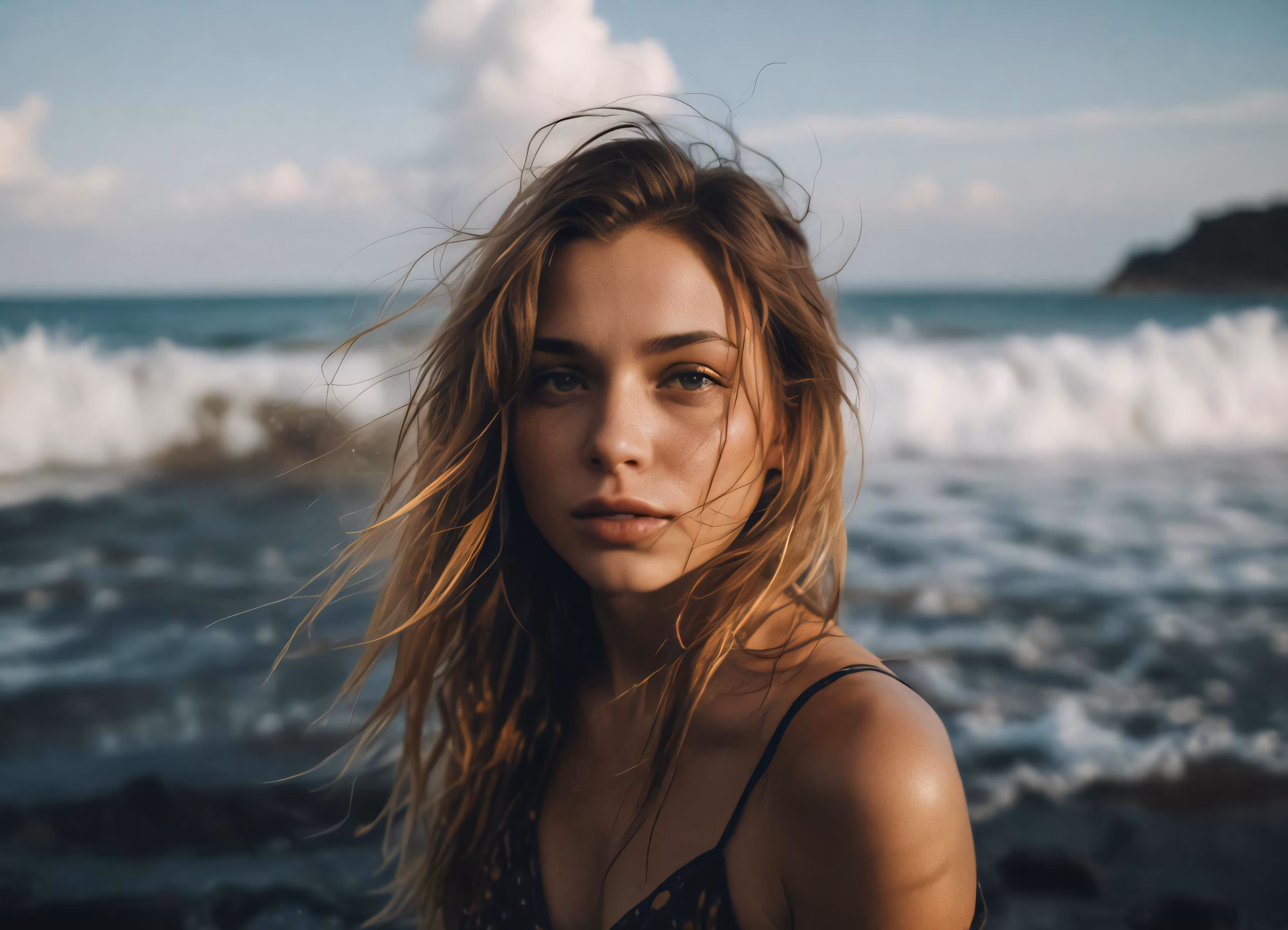 High resolution picture, free to use, a beautiful young lady standing next to an ocean with waves