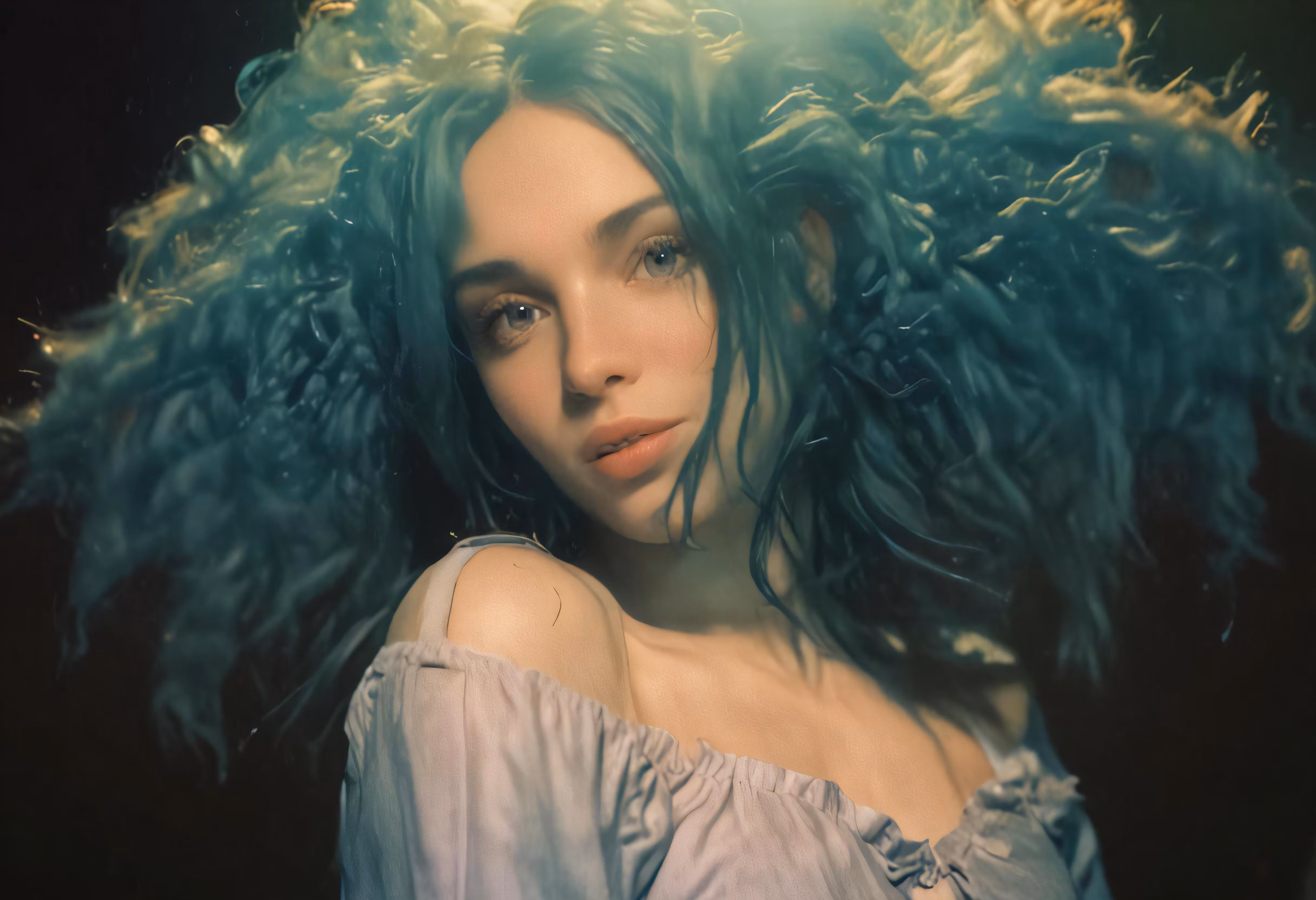 High resolution picture, free to use, a beautiful young lady wearing green hair with her eyes closed