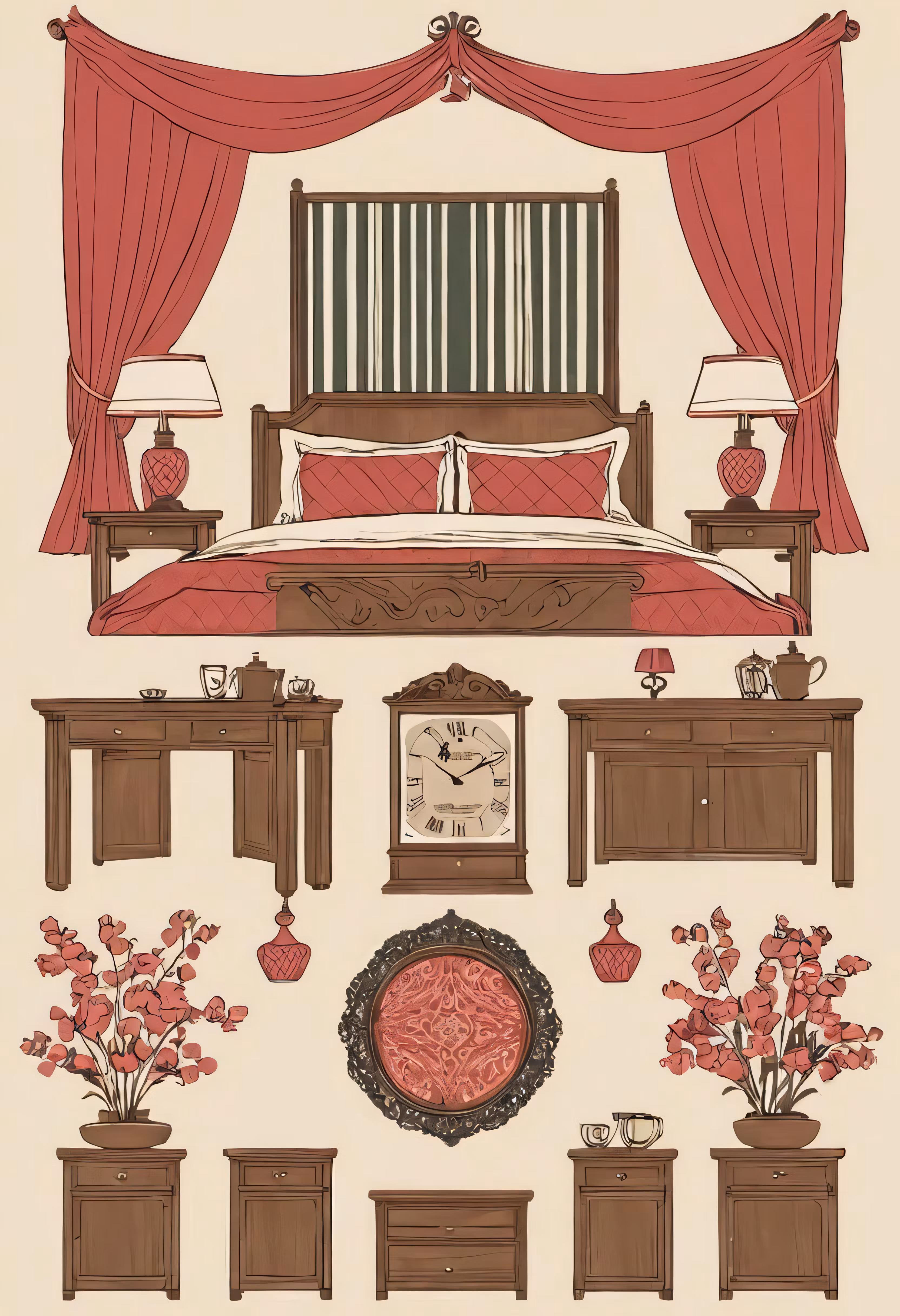 High resolution picture, free to use, a bedroom scene with a bed, dresser and lamp