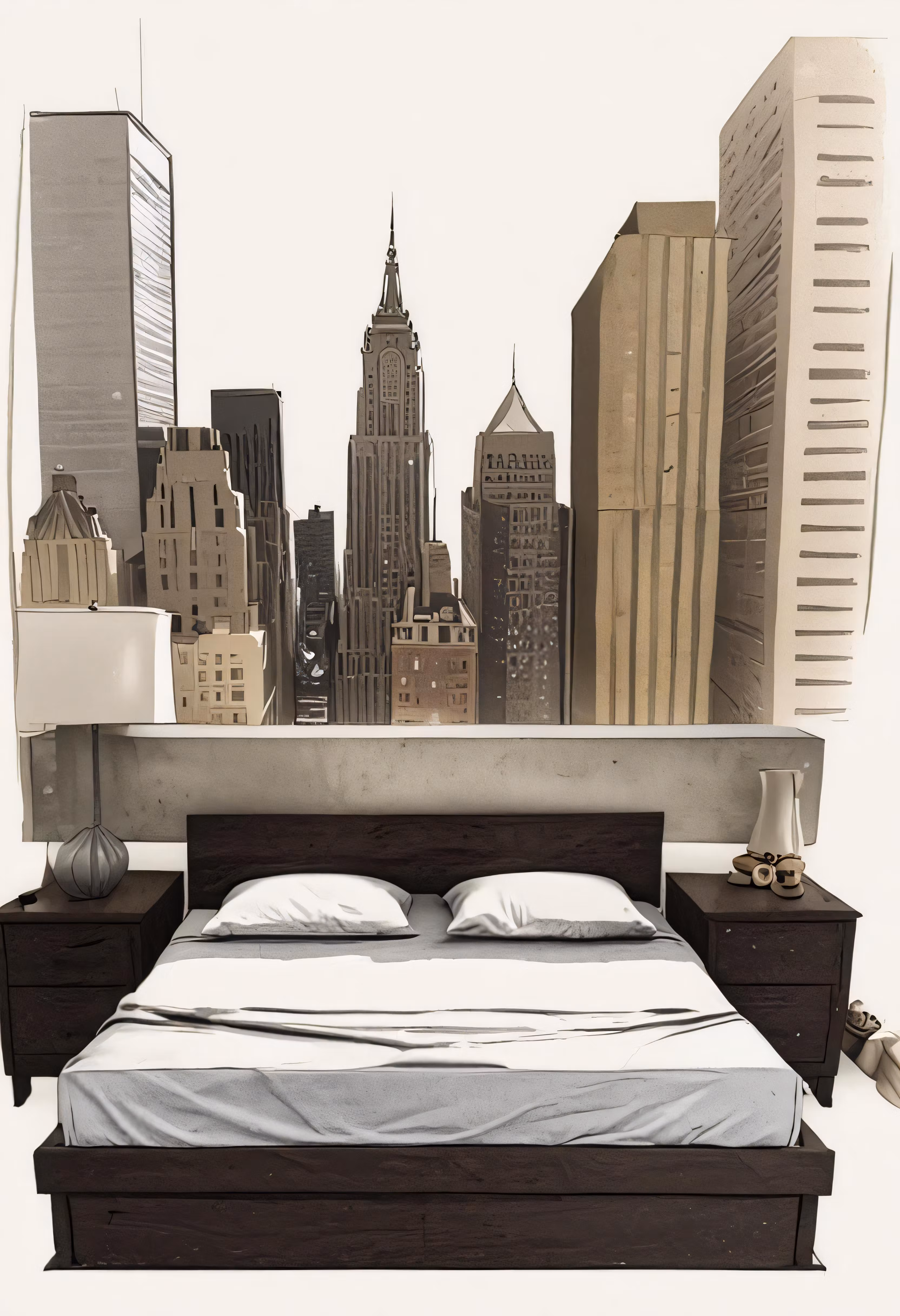 High resolution picture, free to use, a bedroom wall mural with an urban view