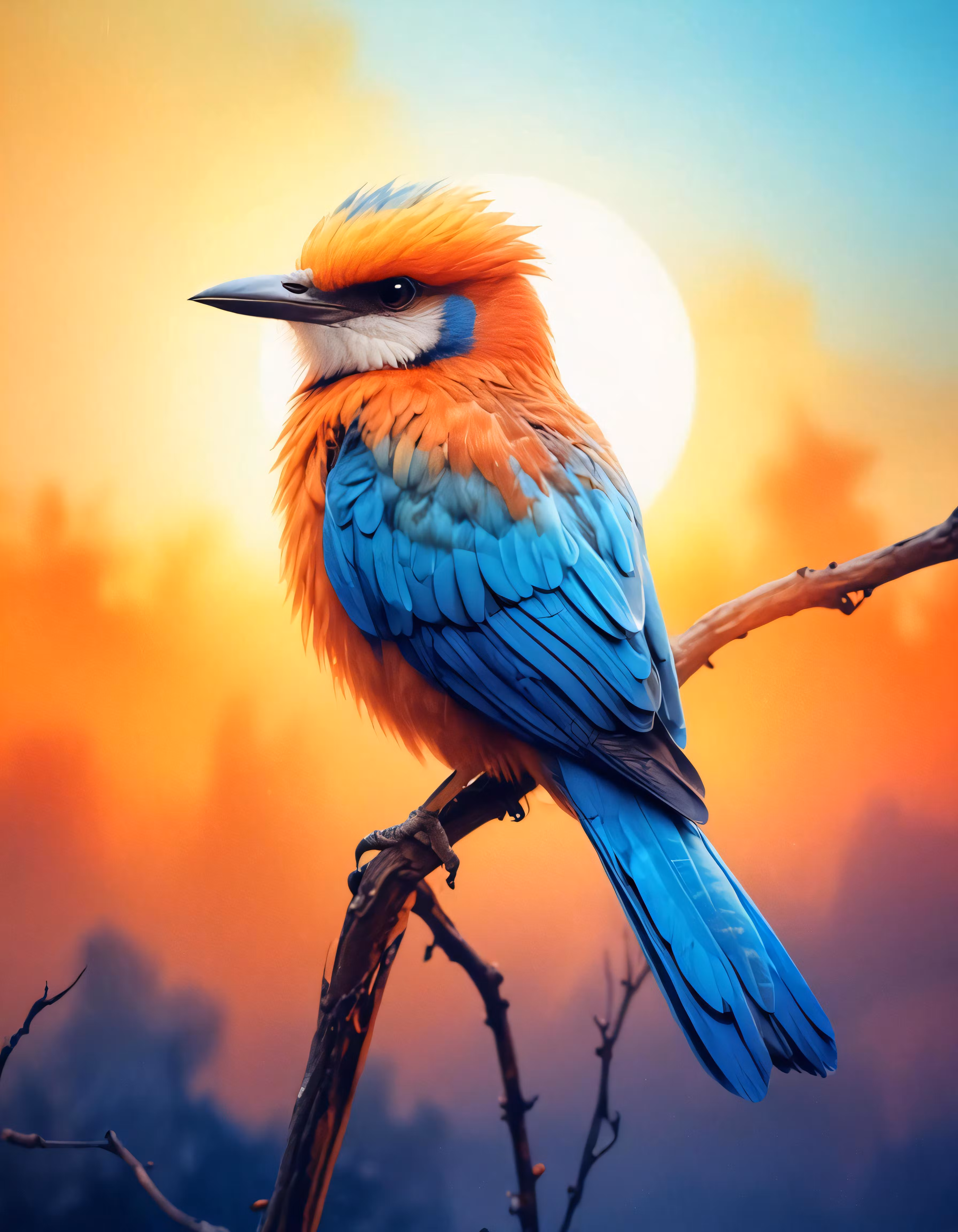 High resolution picture, free to use, a bird is sitting on top of a tree branch with the sun in the background