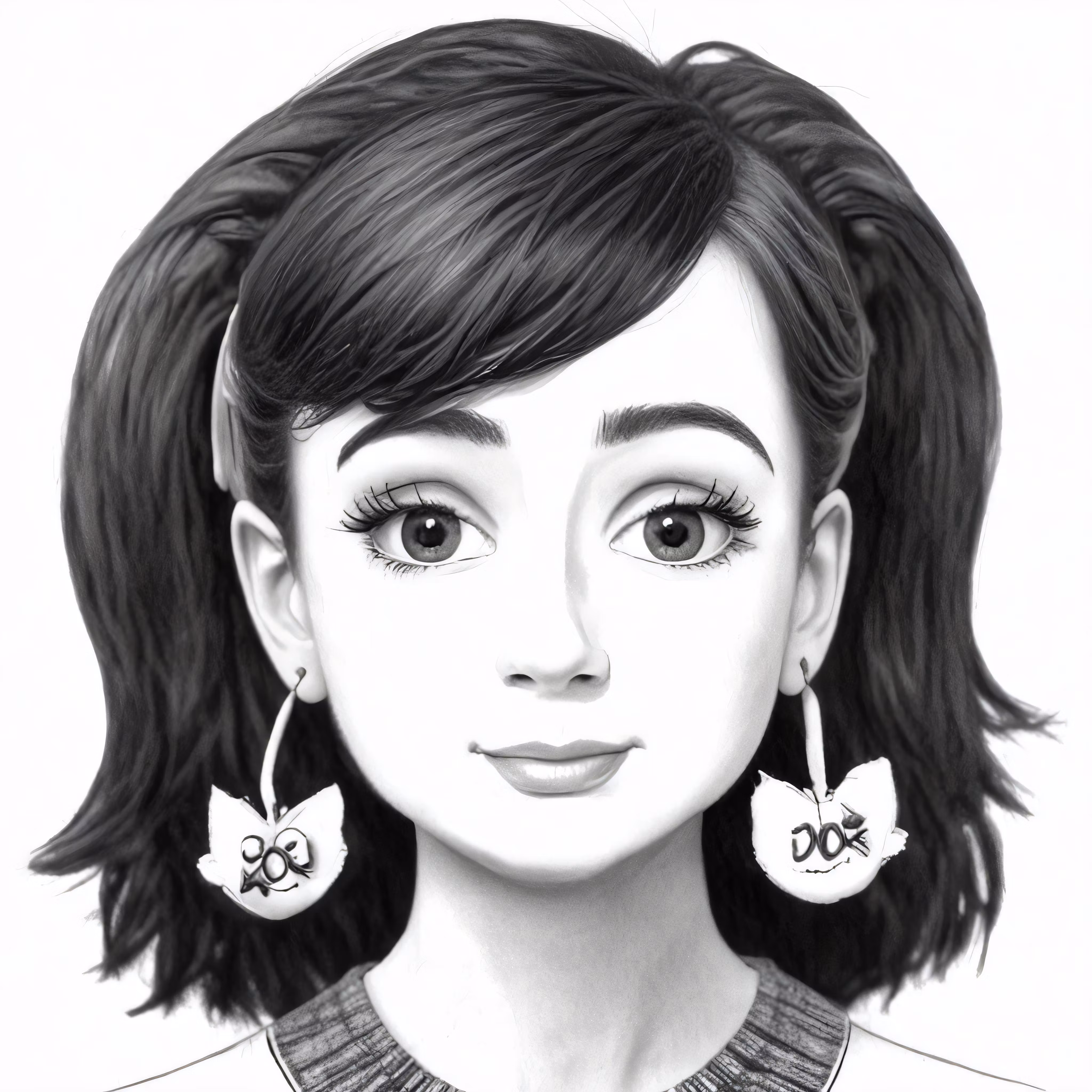 High resolution picture, free to use, a black and white drawing of a girl with large earrings