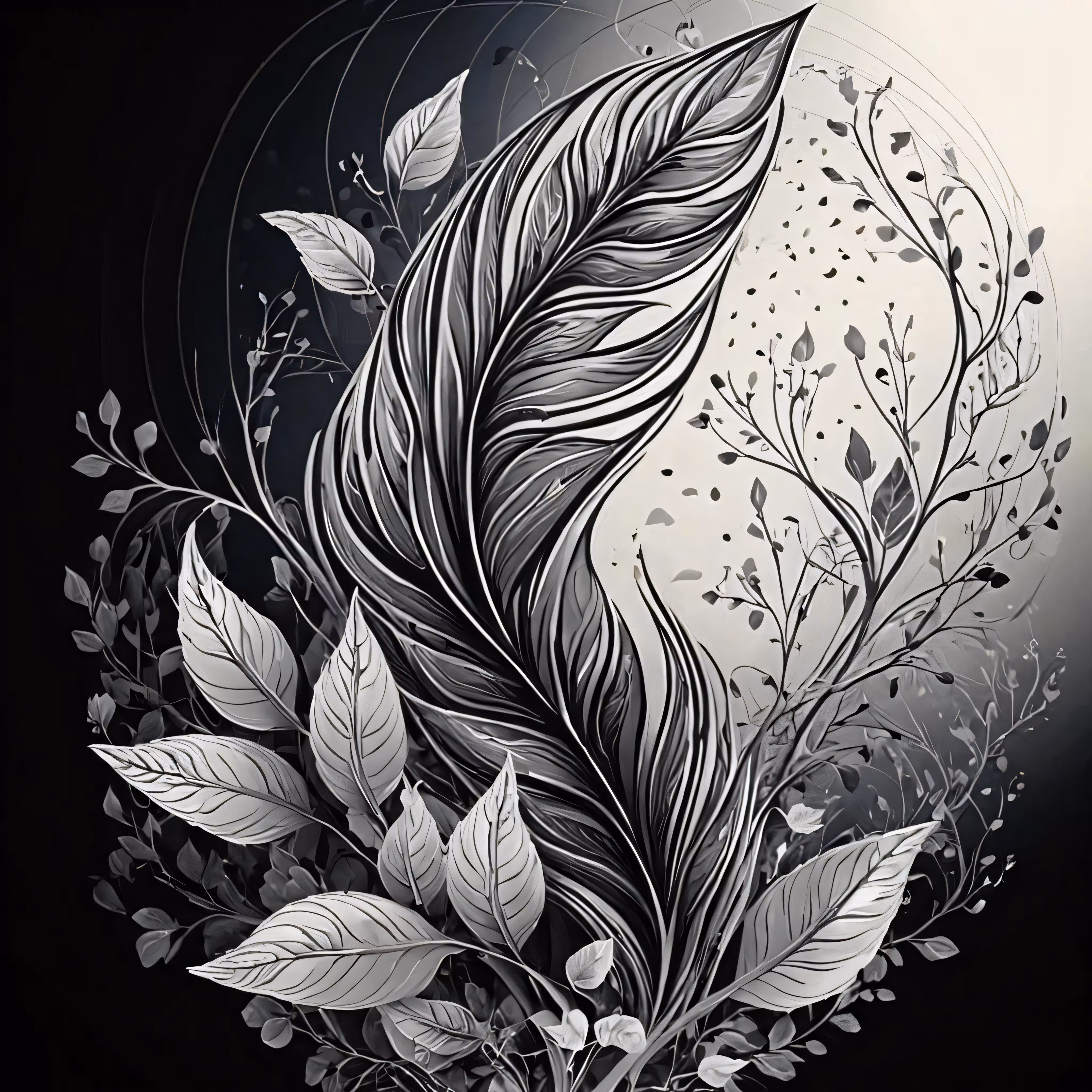 High resolution picture, free to use, a black and white illustration of leaves on a circle
