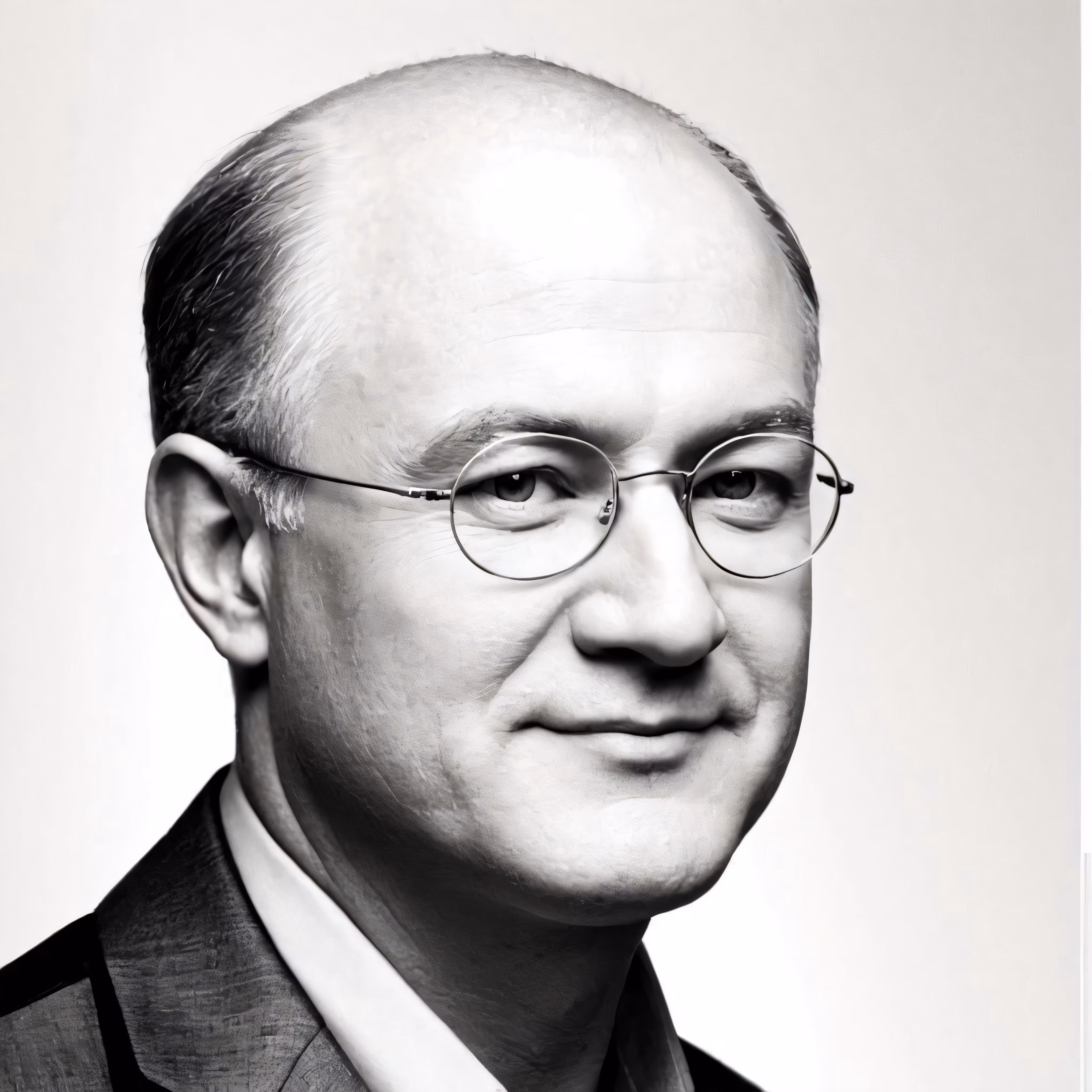 High resolution picture, free to use, a black and white photo of a bald man in suit and tie