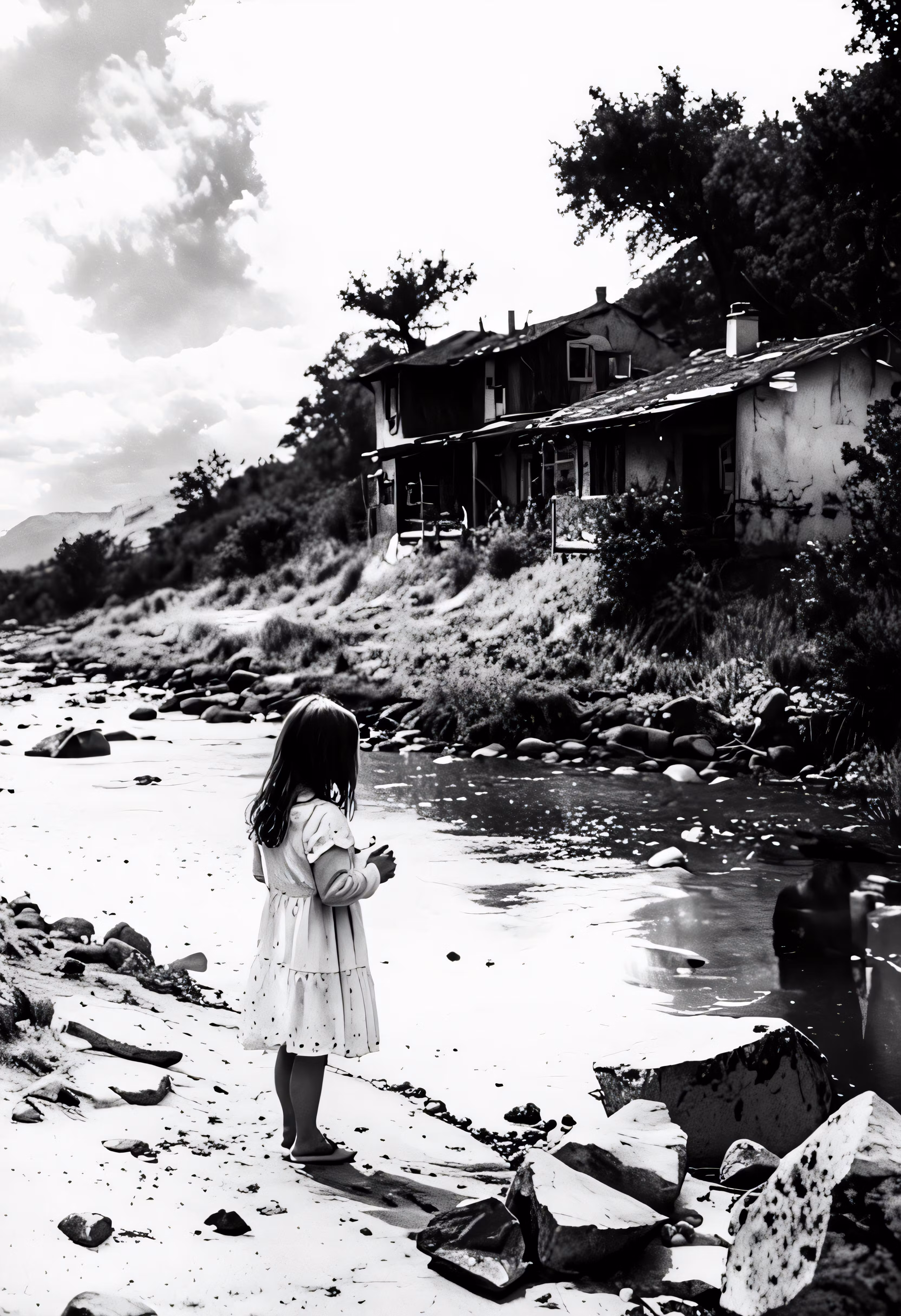 High resolution picture, free to use, a black and white photo of a little girl standing near the water