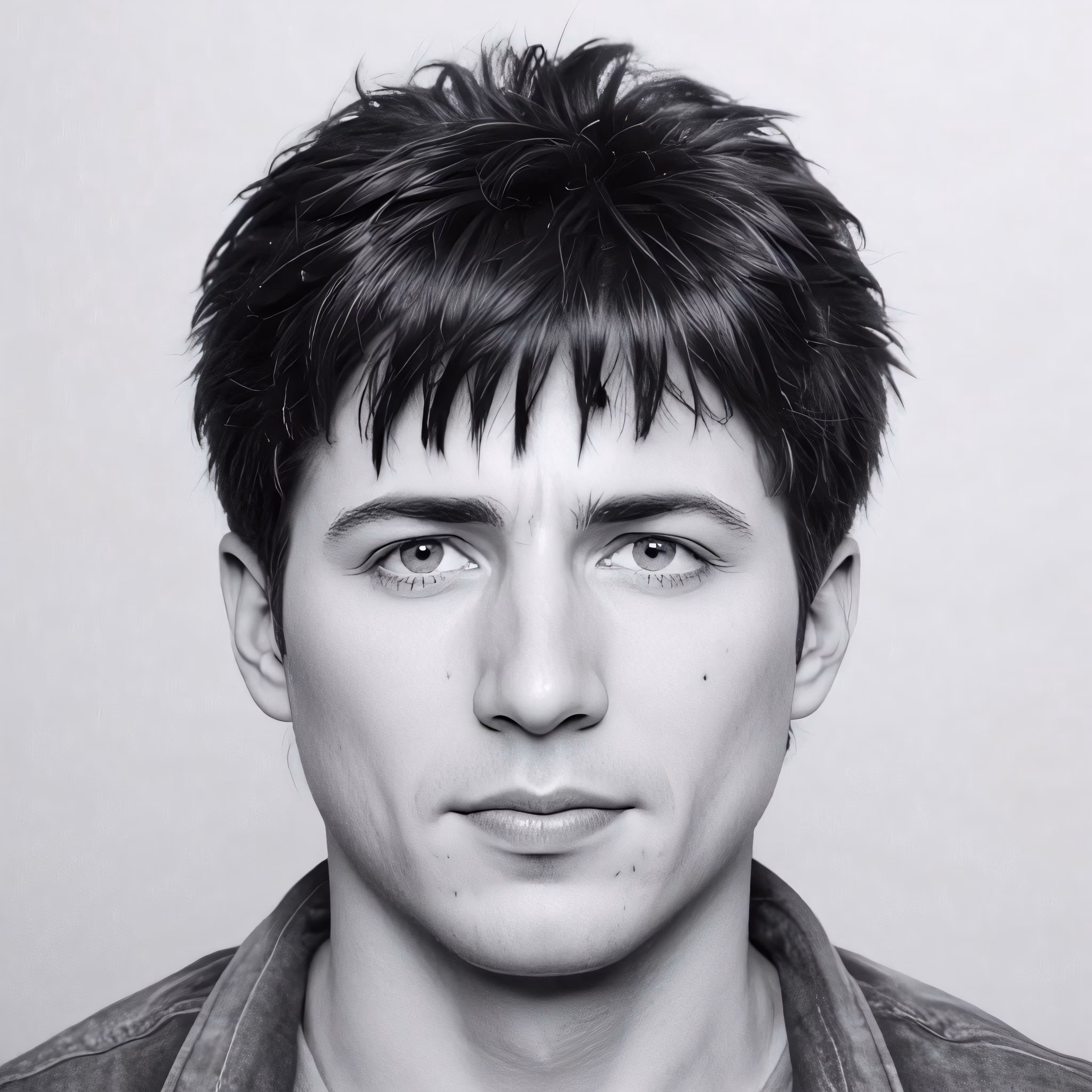 High resolution picture, free to use, a black and white photo of a man with long hair