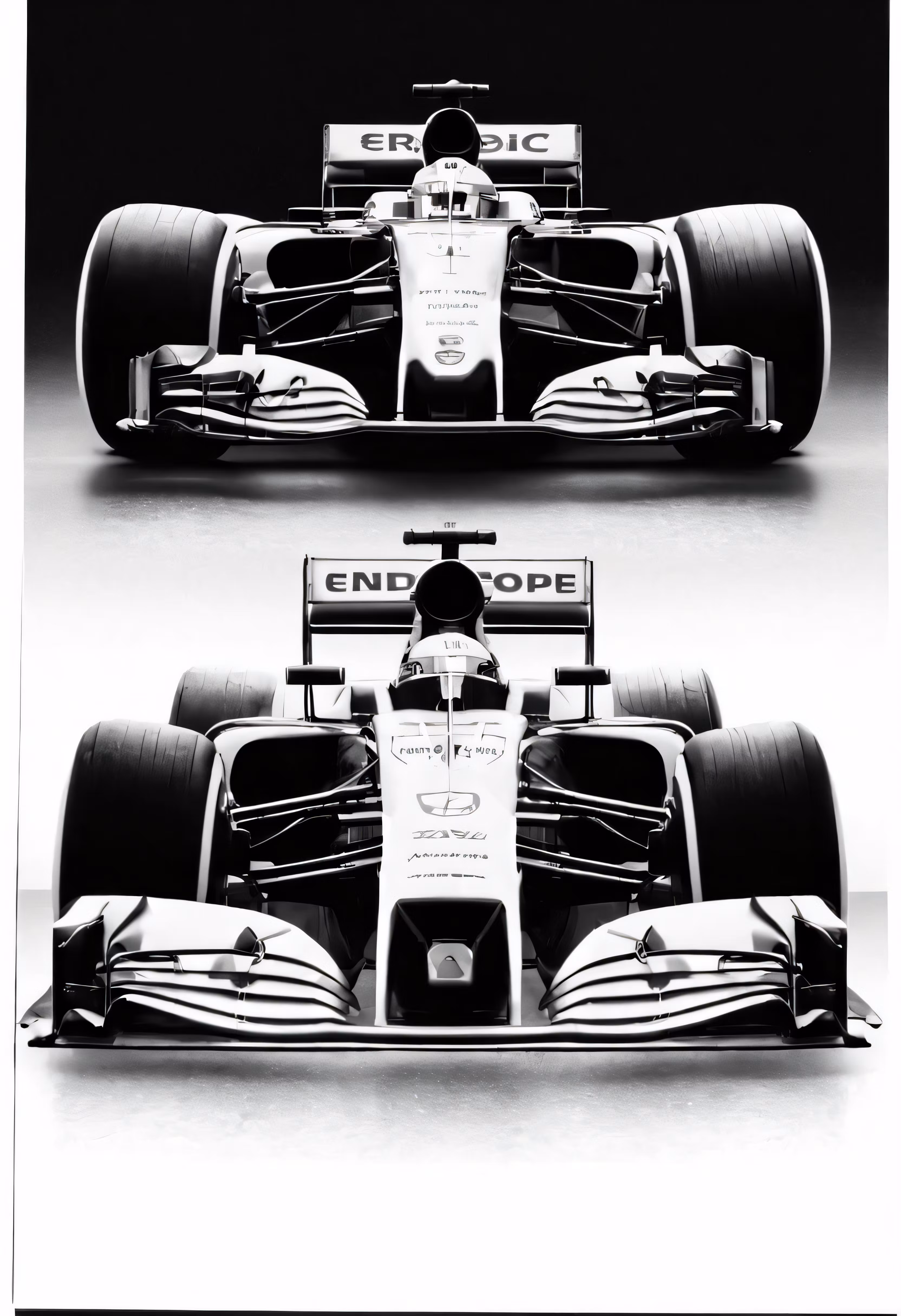 High resolution picture, free to use, a black and white photo of the front side of a formula race car
