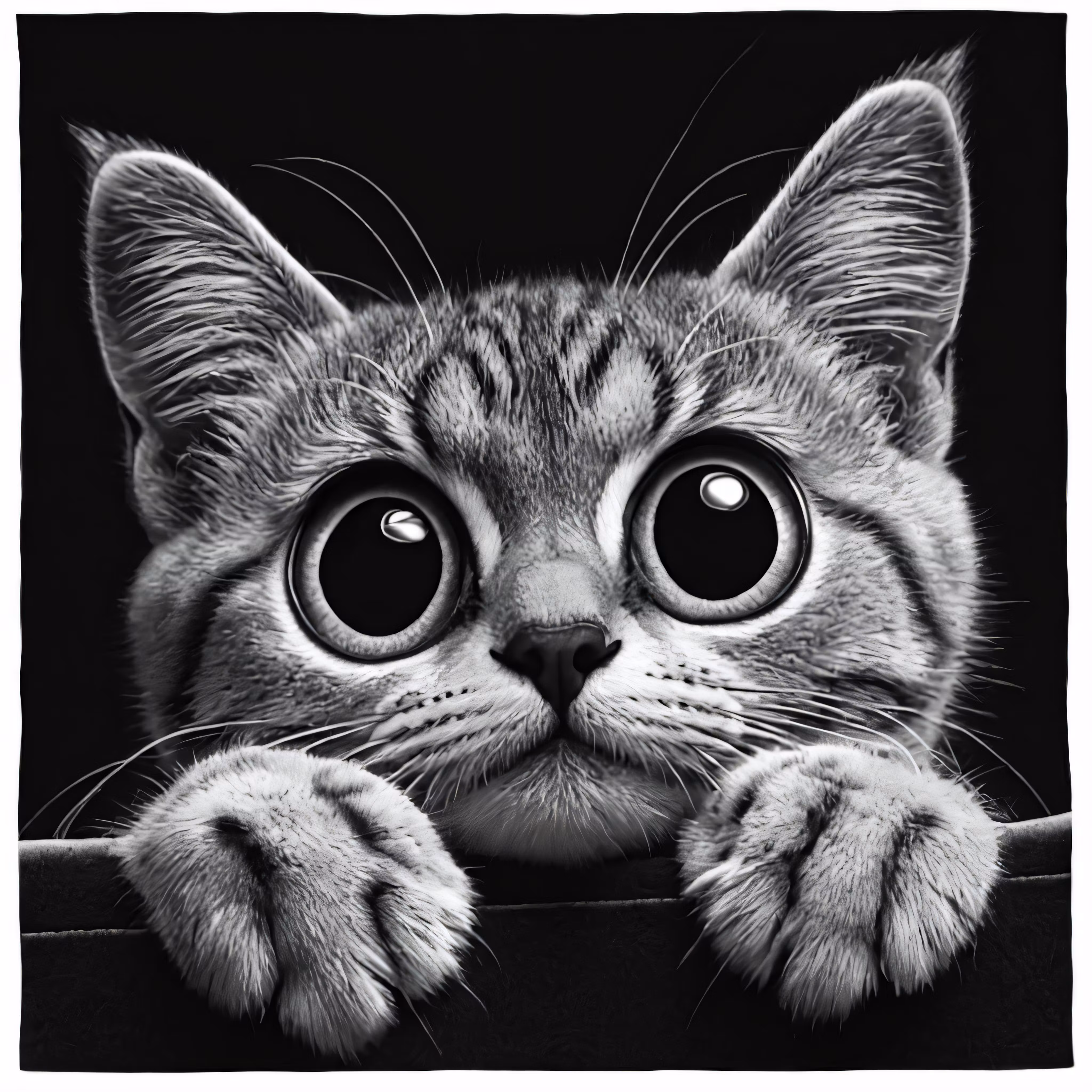High resolution picture, free to use, a black and white photograph of a kitten with big eyes