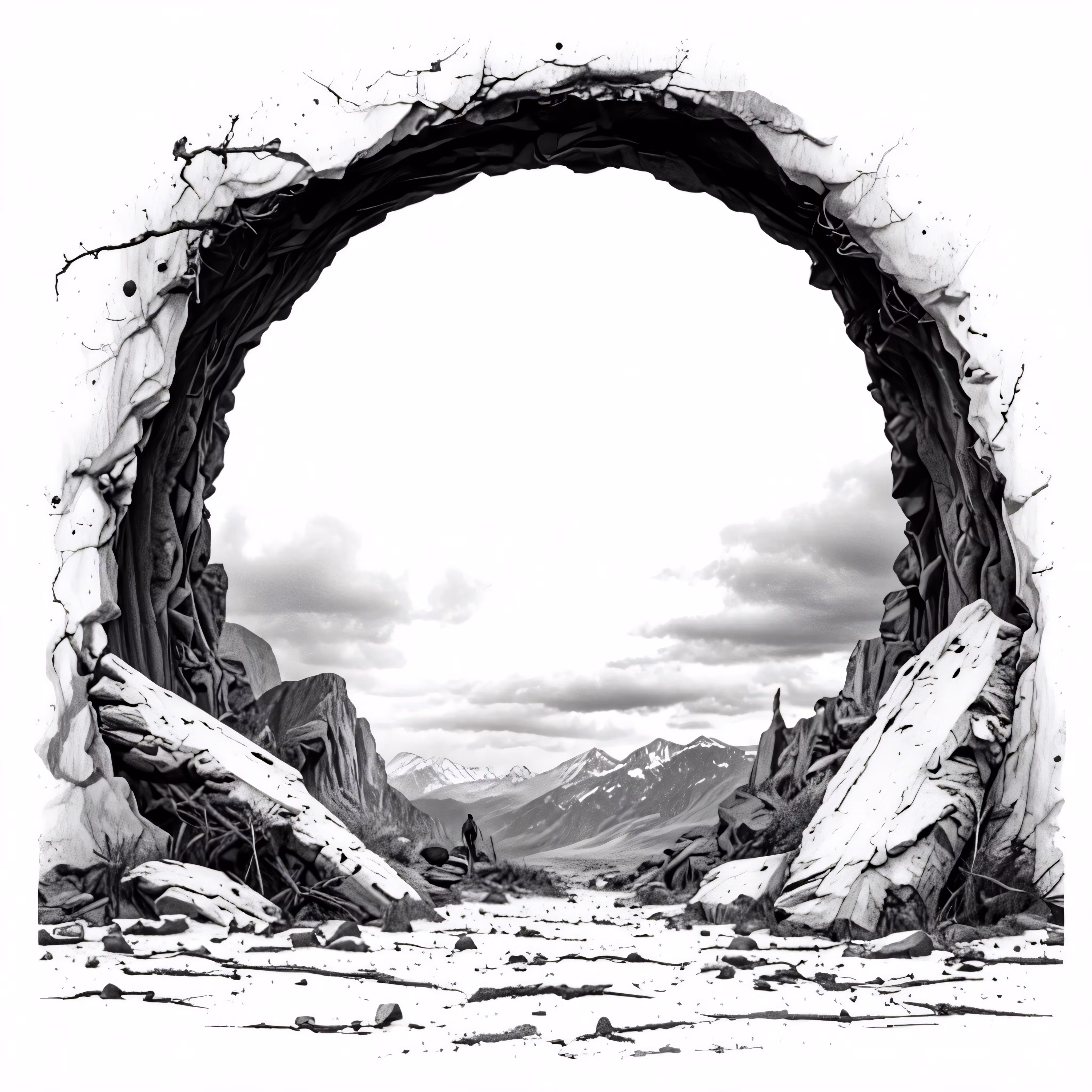 High resolution picture, free to use, a black and white photograph of an old abandoned archway in the middle of a barren landscape