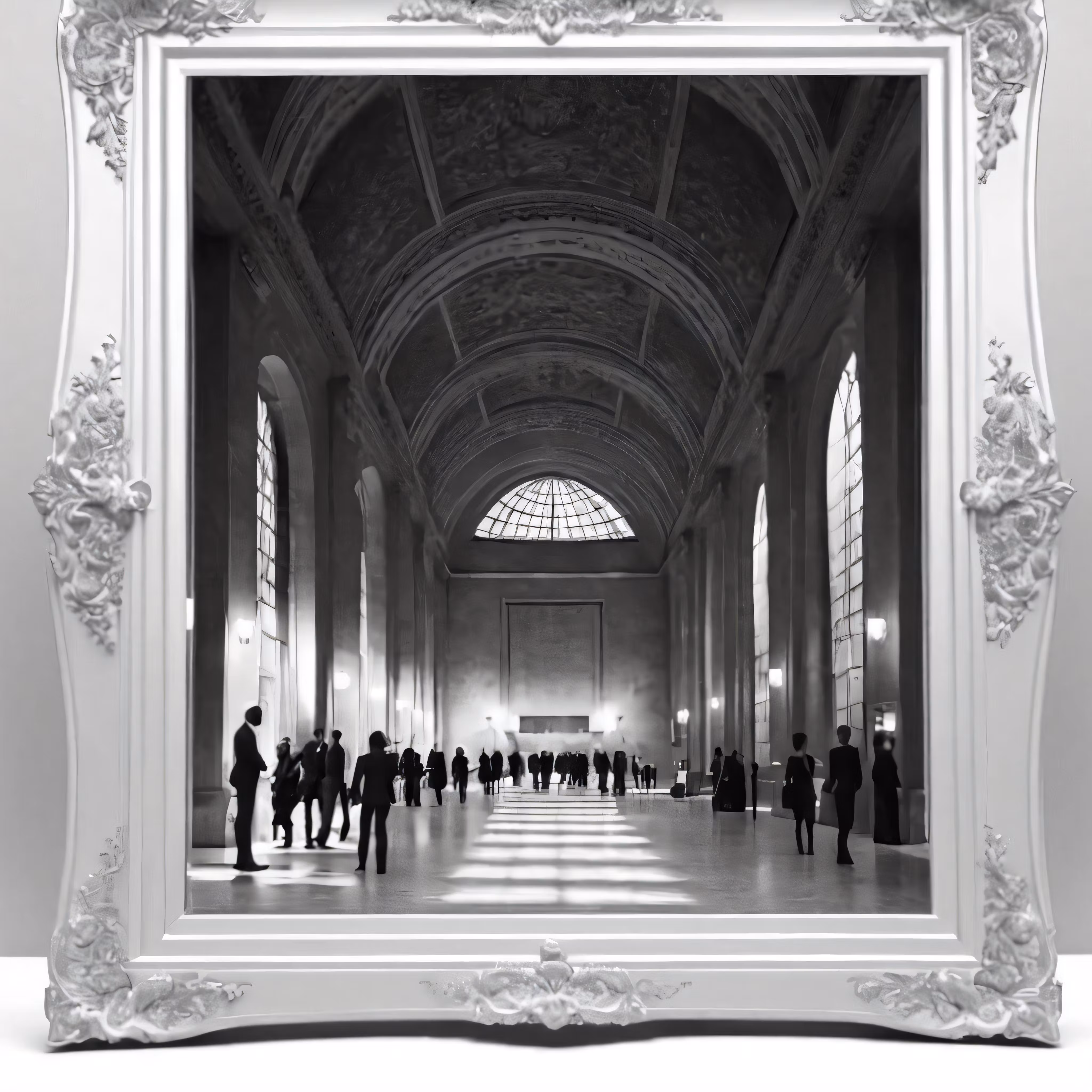 High resolution picture, free to use, a black and white photograph of people walking through a large building