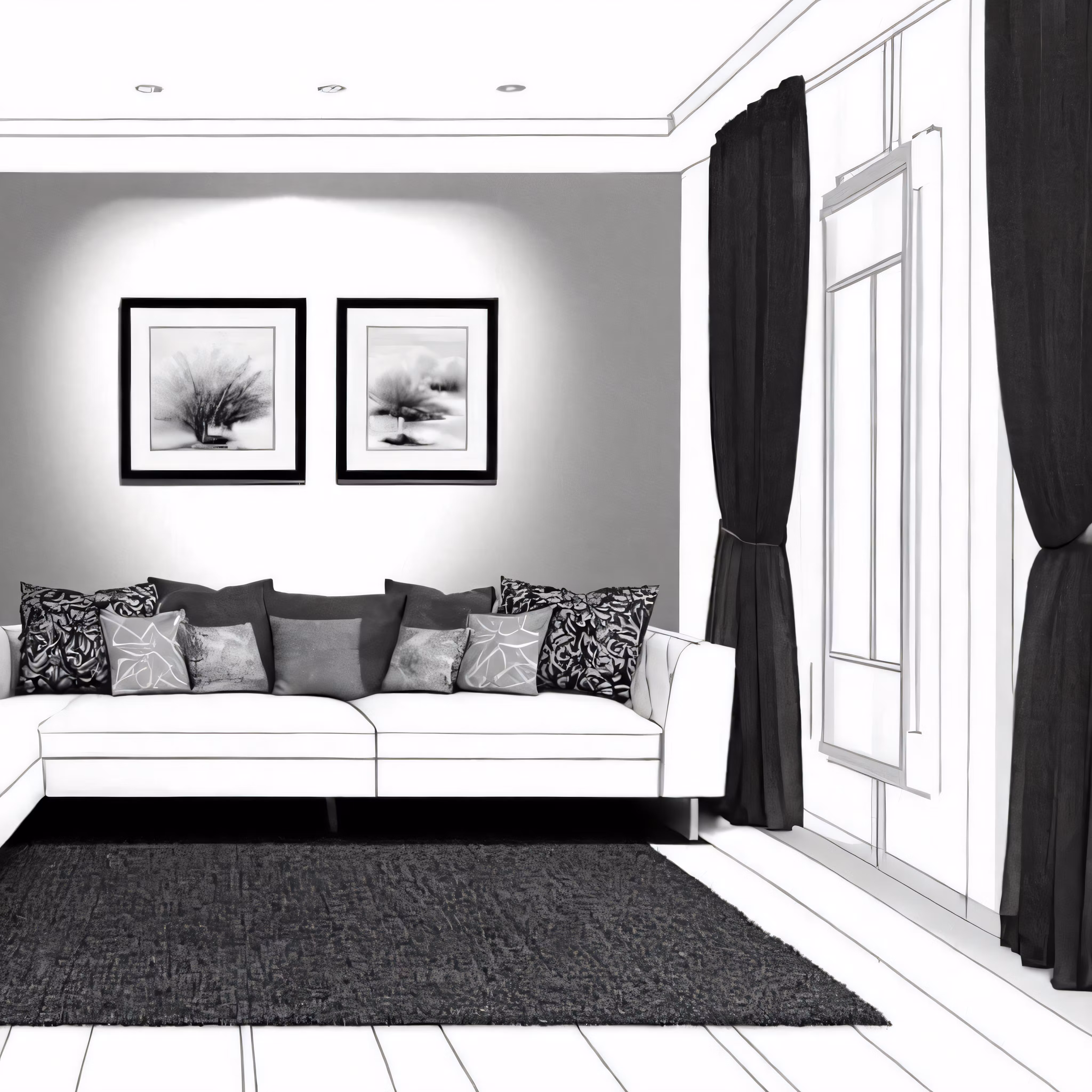 High resolution picture, free to use, a black and white room with couch, window, rug and two pictures on the wall