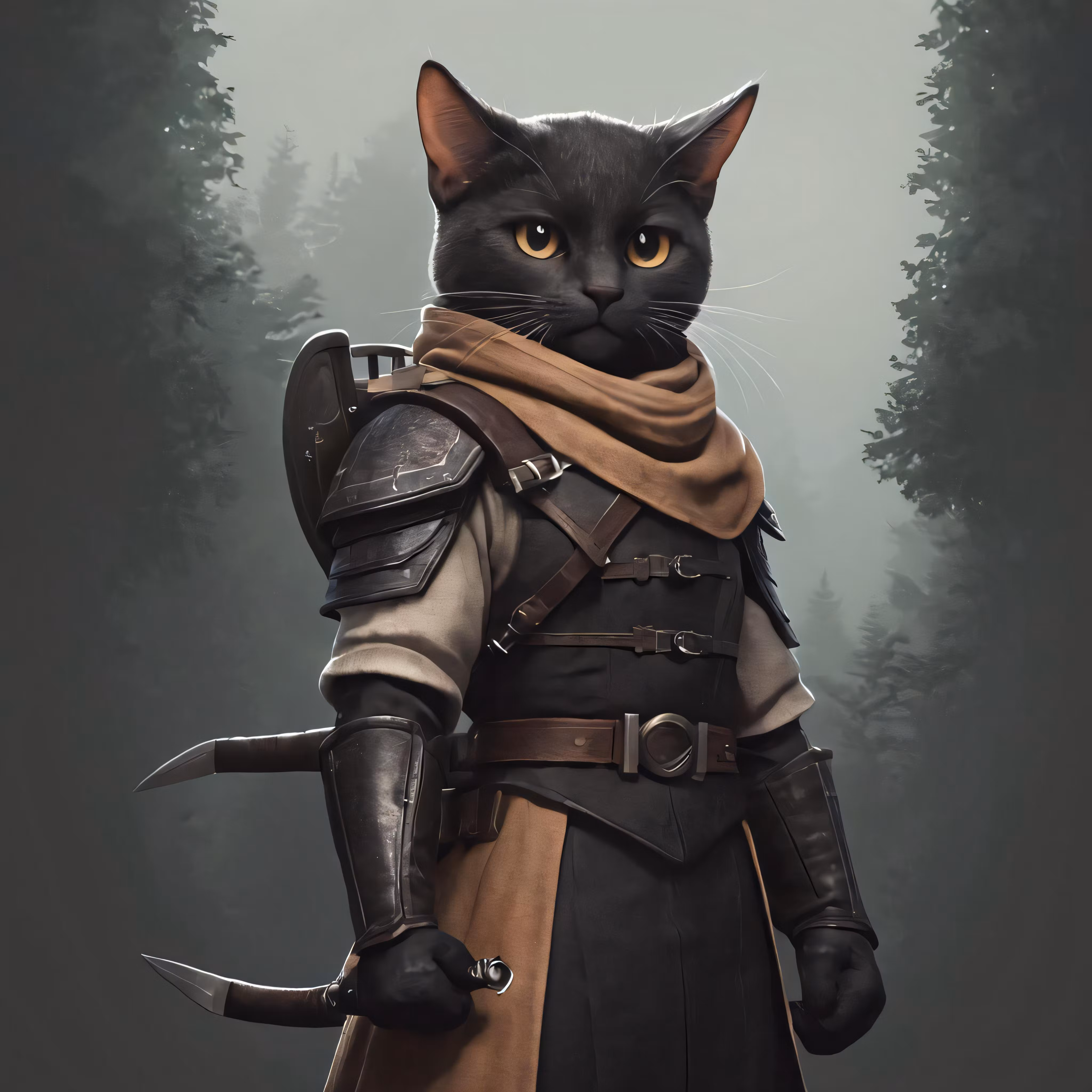 High resolution picture, free to use, a black cat dressed in medieval clothing standing next to a forest