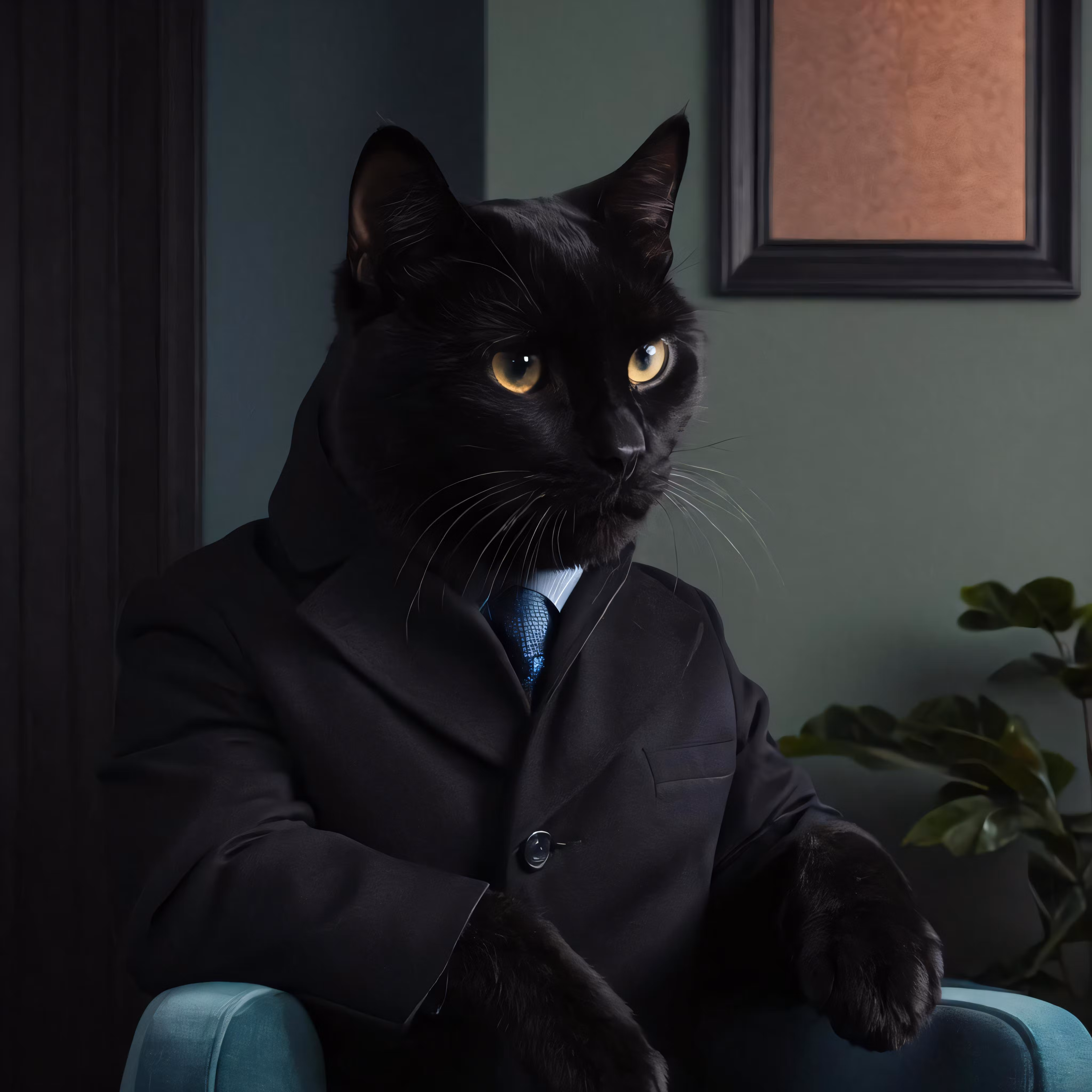 High resolution picture, free to use, a black cat dressed in suit and tie sitting on a blue chair