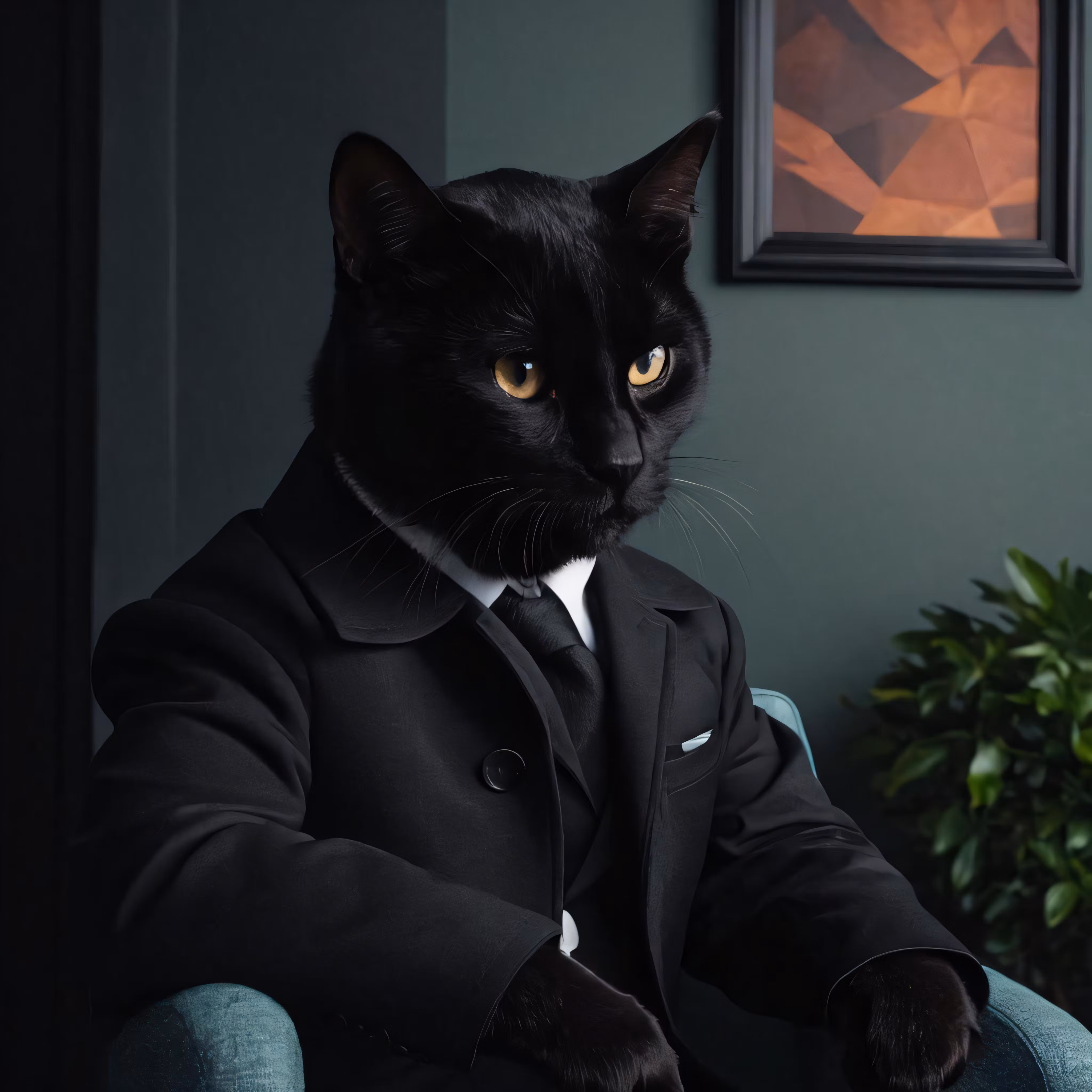 High resolution picture, free to use, a black cat in a business suit and tie sitting in a chair