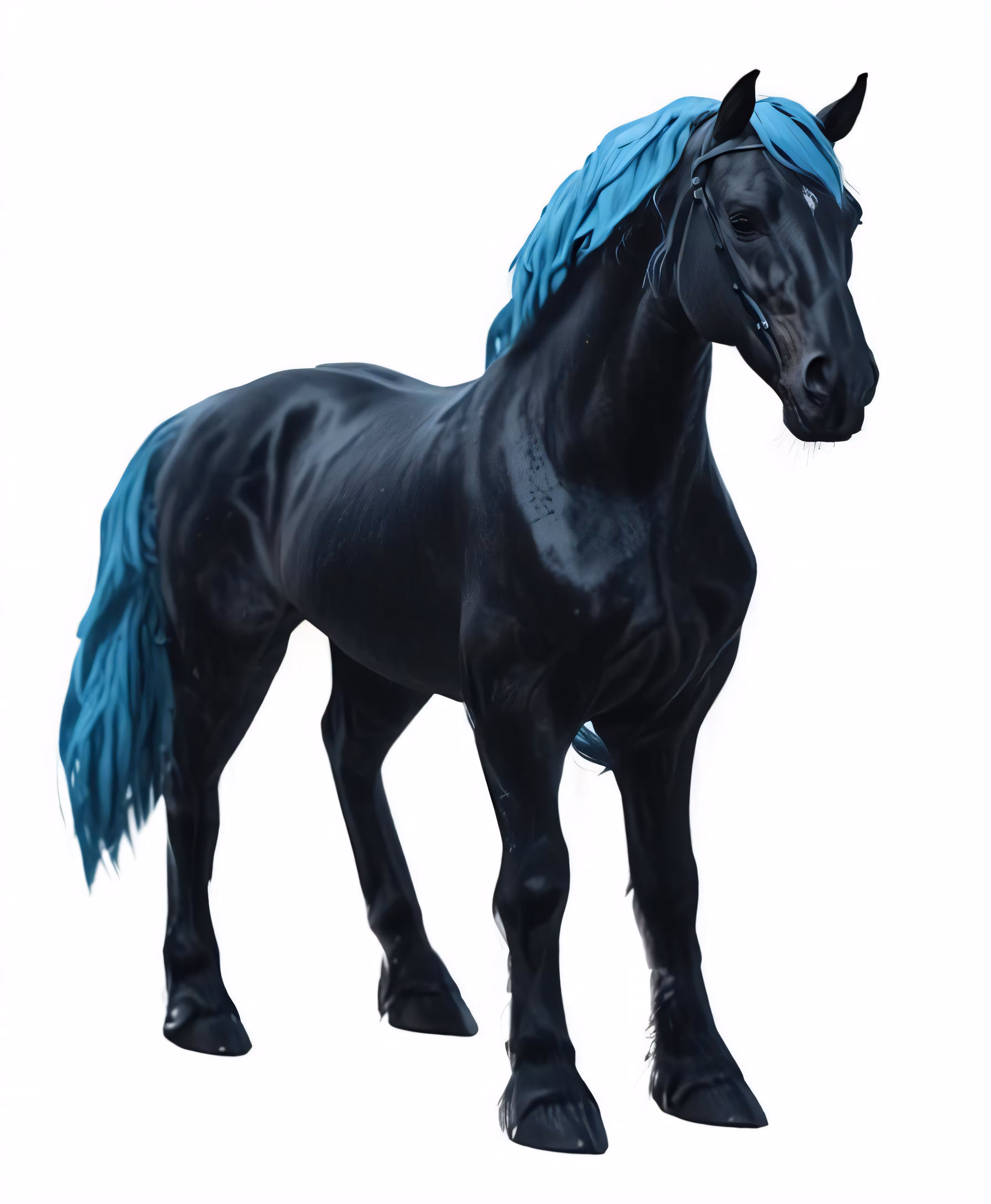 High resolution picture, free to use, a black horse with bright blue mane is standing still