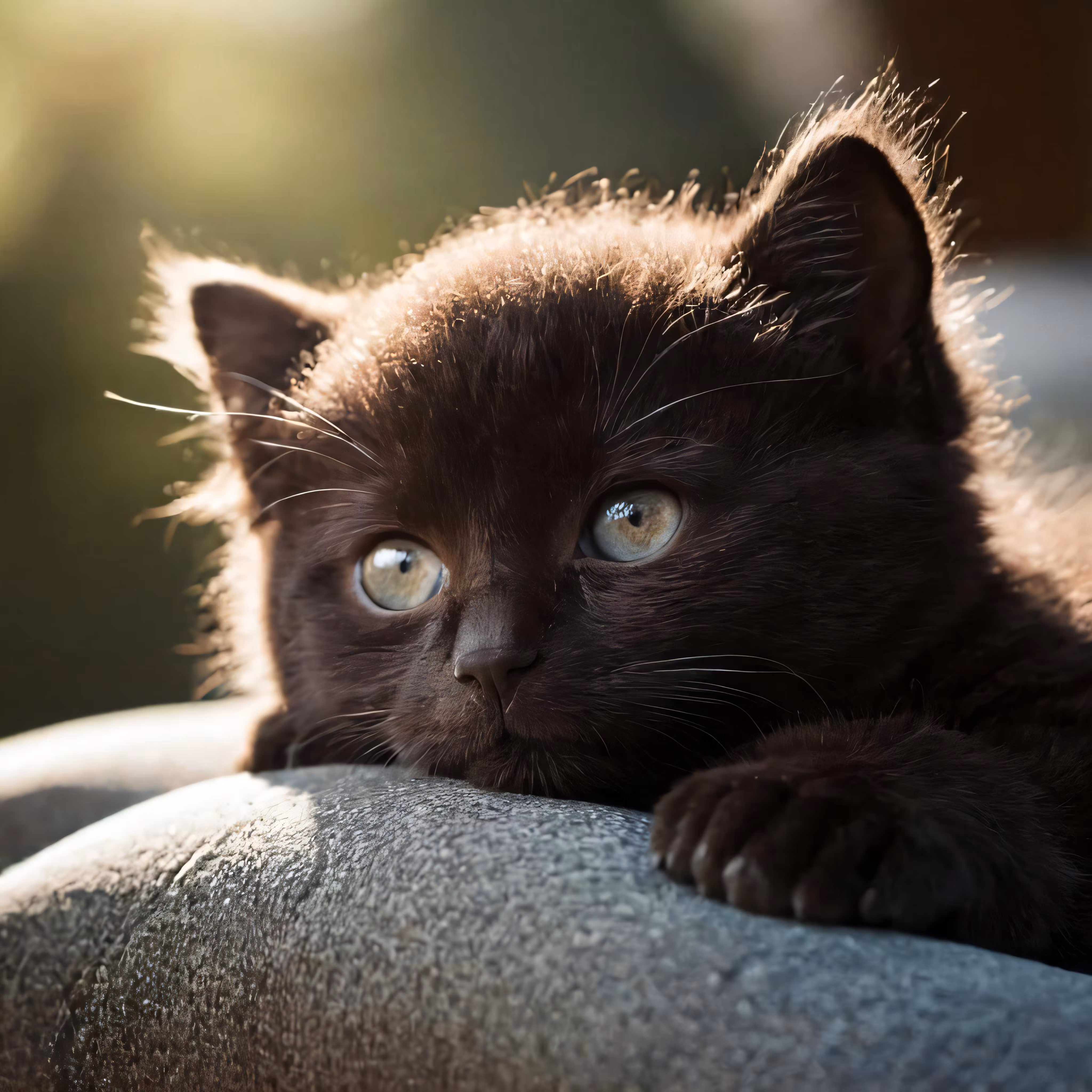 High resolution picture, free to use, a black kitten rests his head on the arm of someone