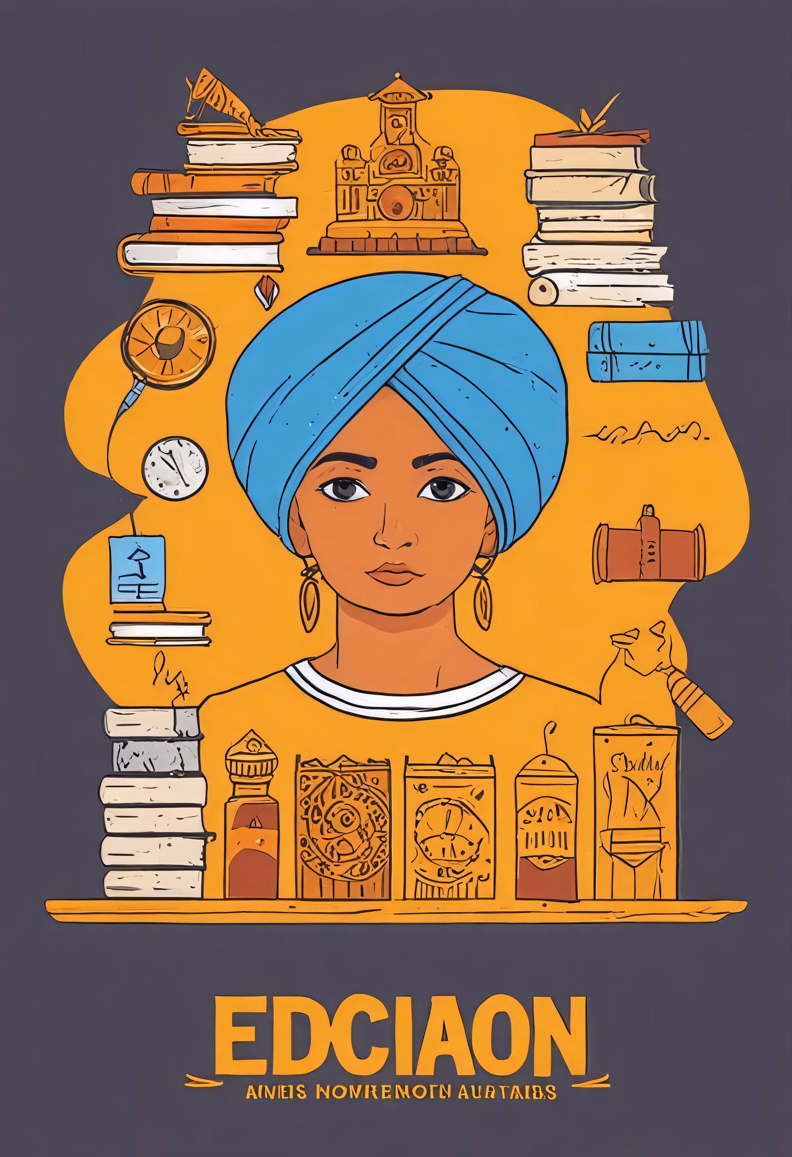 High resolution picture, free to use, a black woman with a blue turban surrounded by icons