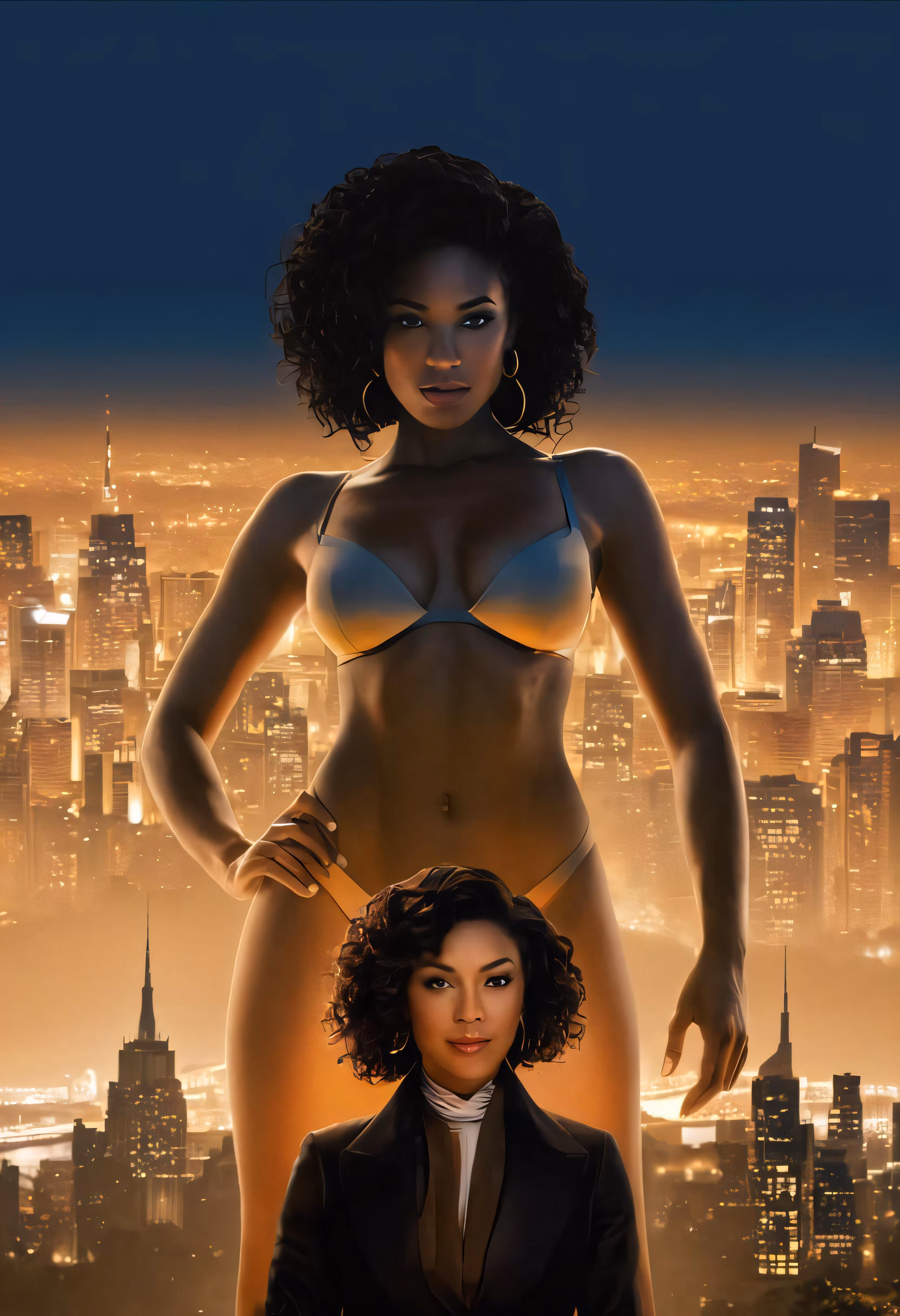 High resolution picture, free to use, a black woman with short hair and bra stands in front of a lit city