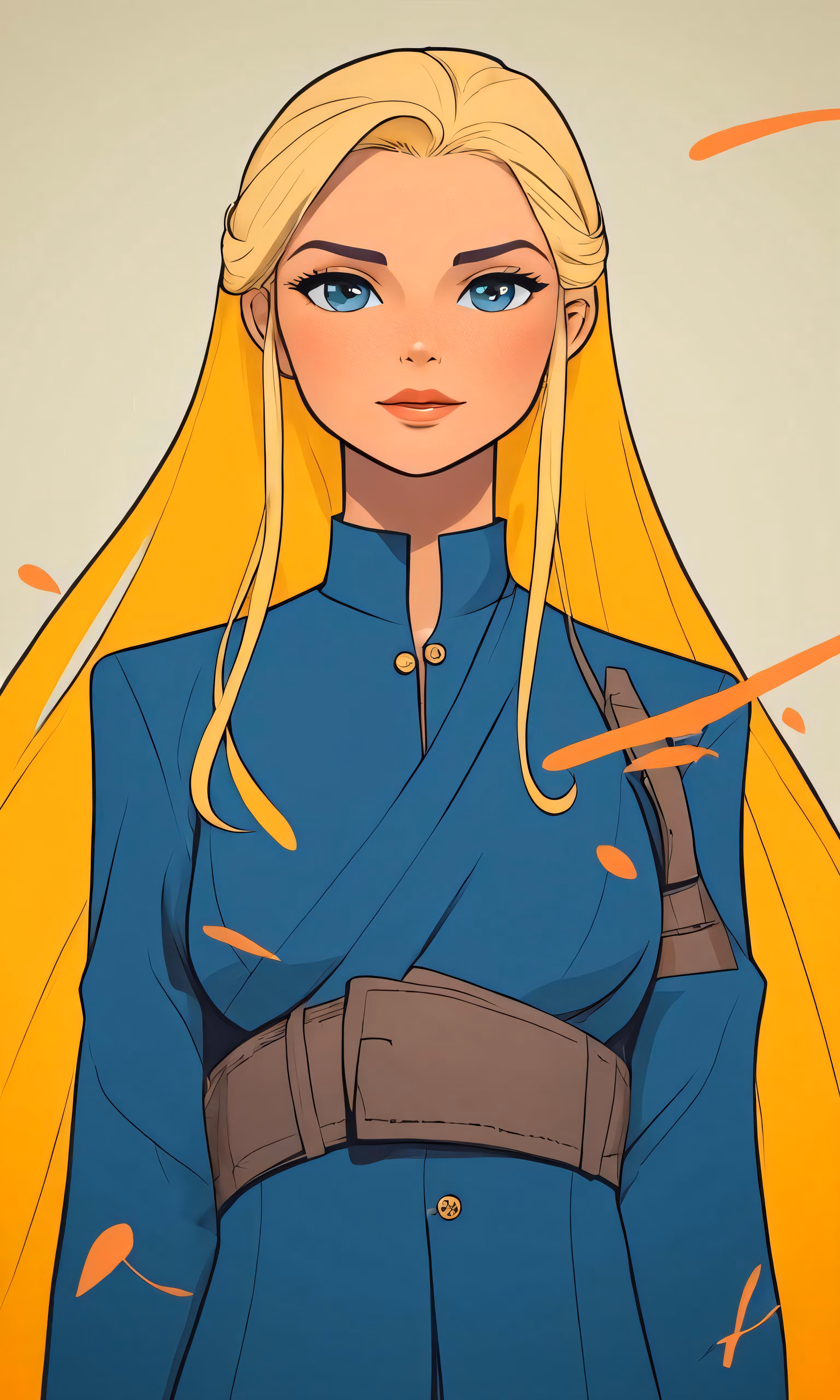 High resolution picture, free to use, a blonde haired lady in blue is wearing an armor and cape