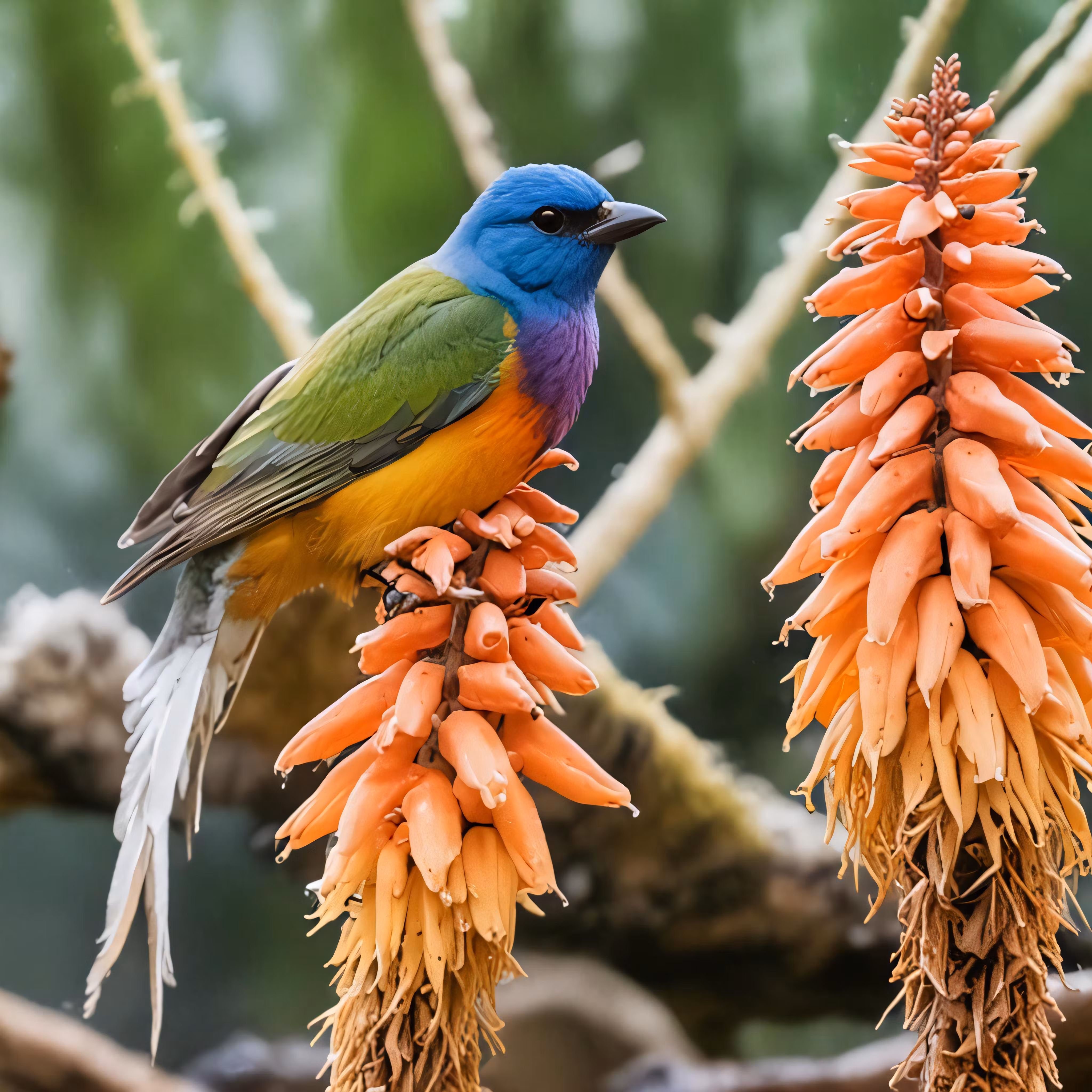 High resolution picture, free to use, a blue, green and yellow bird perches on some flowers