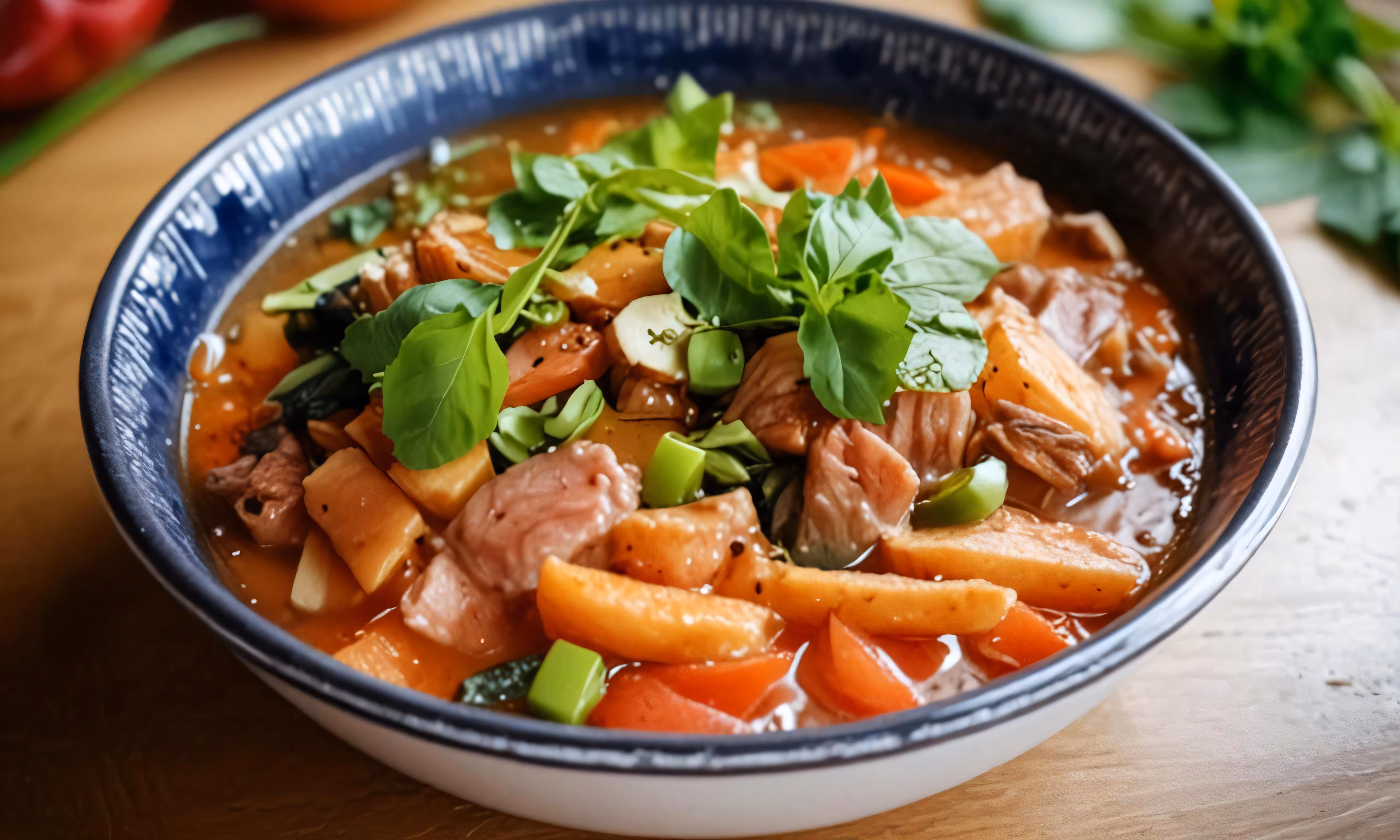 High resolution picture, free to use, a blue and white bowl filled with meat and vegetables