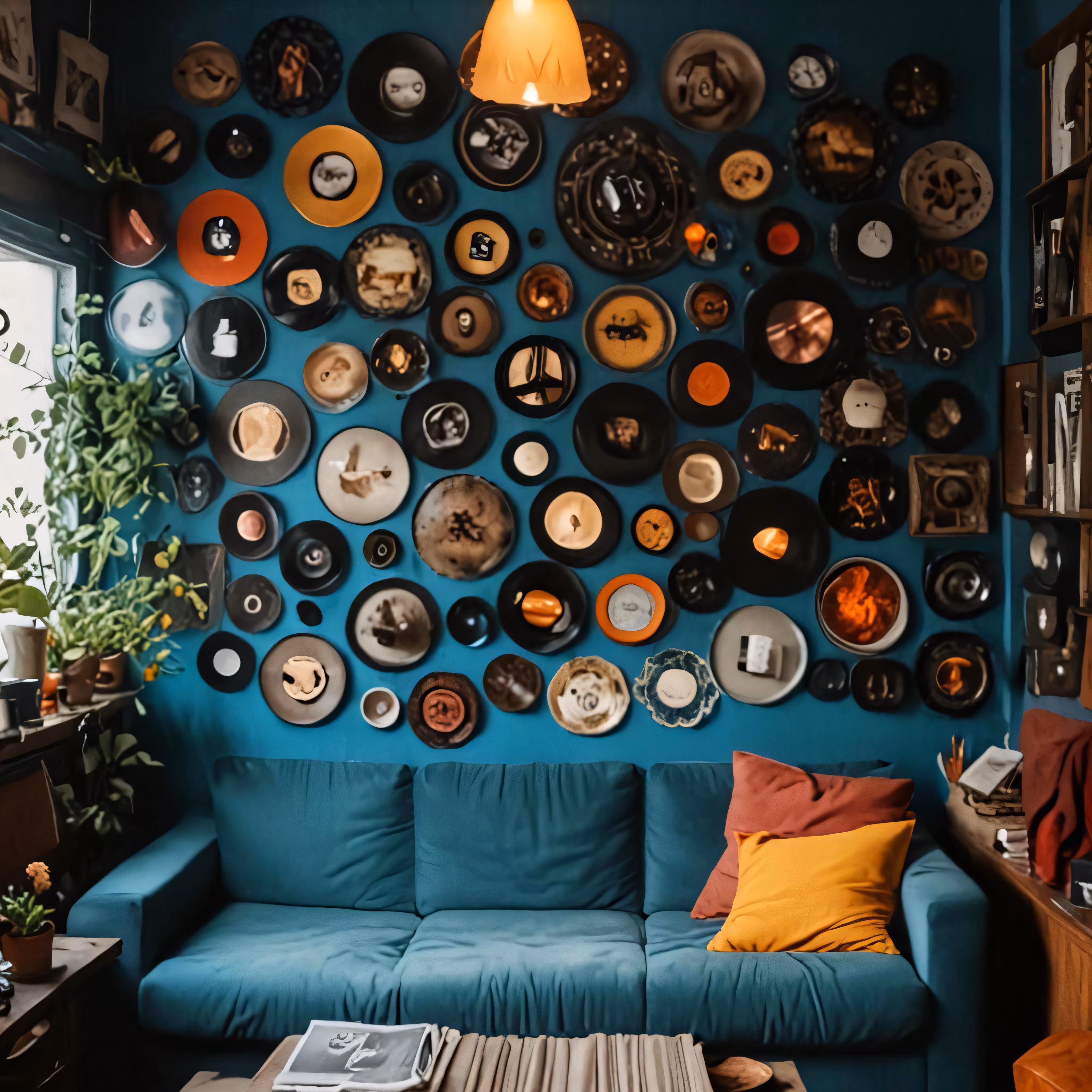 High resolution picture, free to use, a blue couch sitting next to a window and wall covered in circular clocks