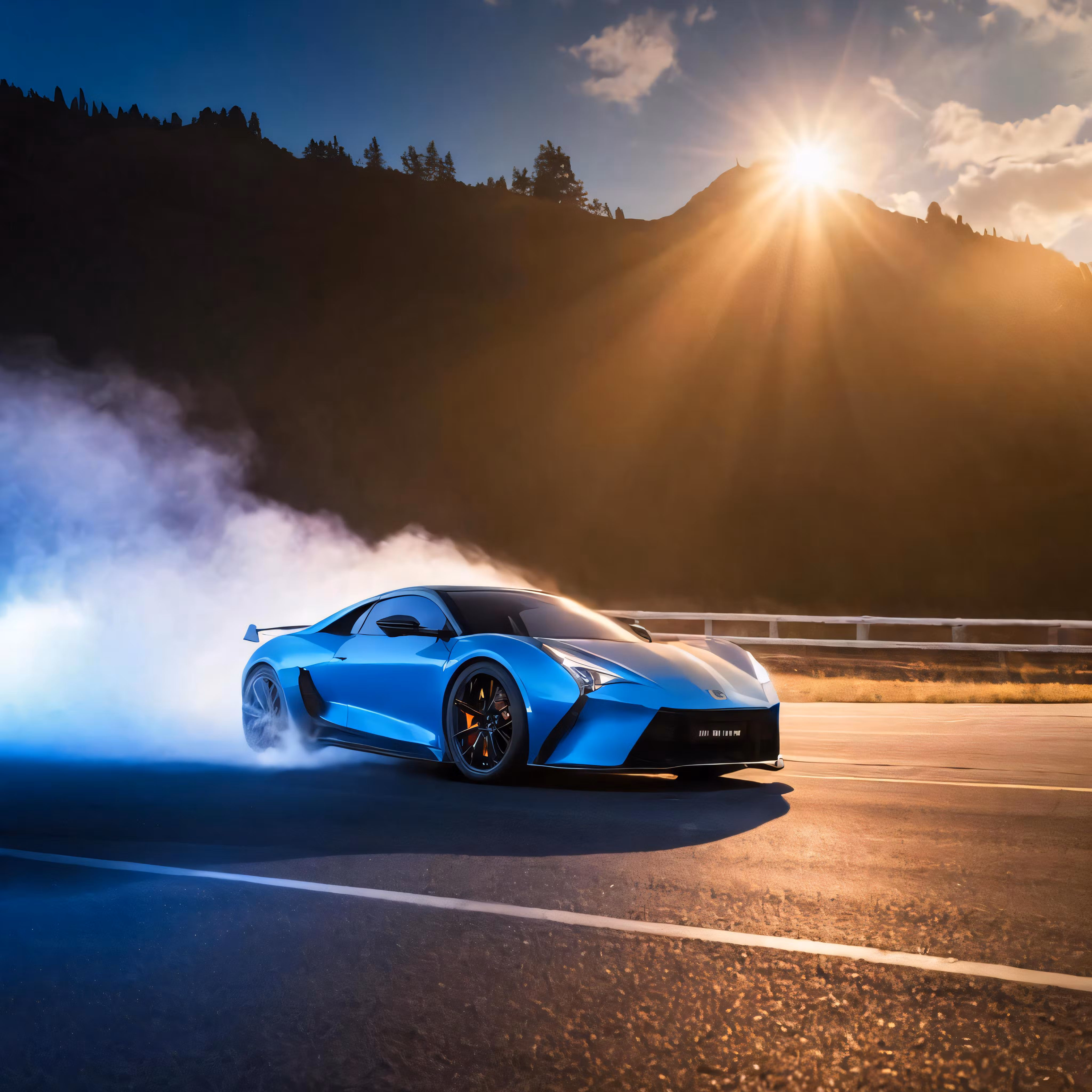 High resolution picture, free to use, a blue sports car is driving down a road