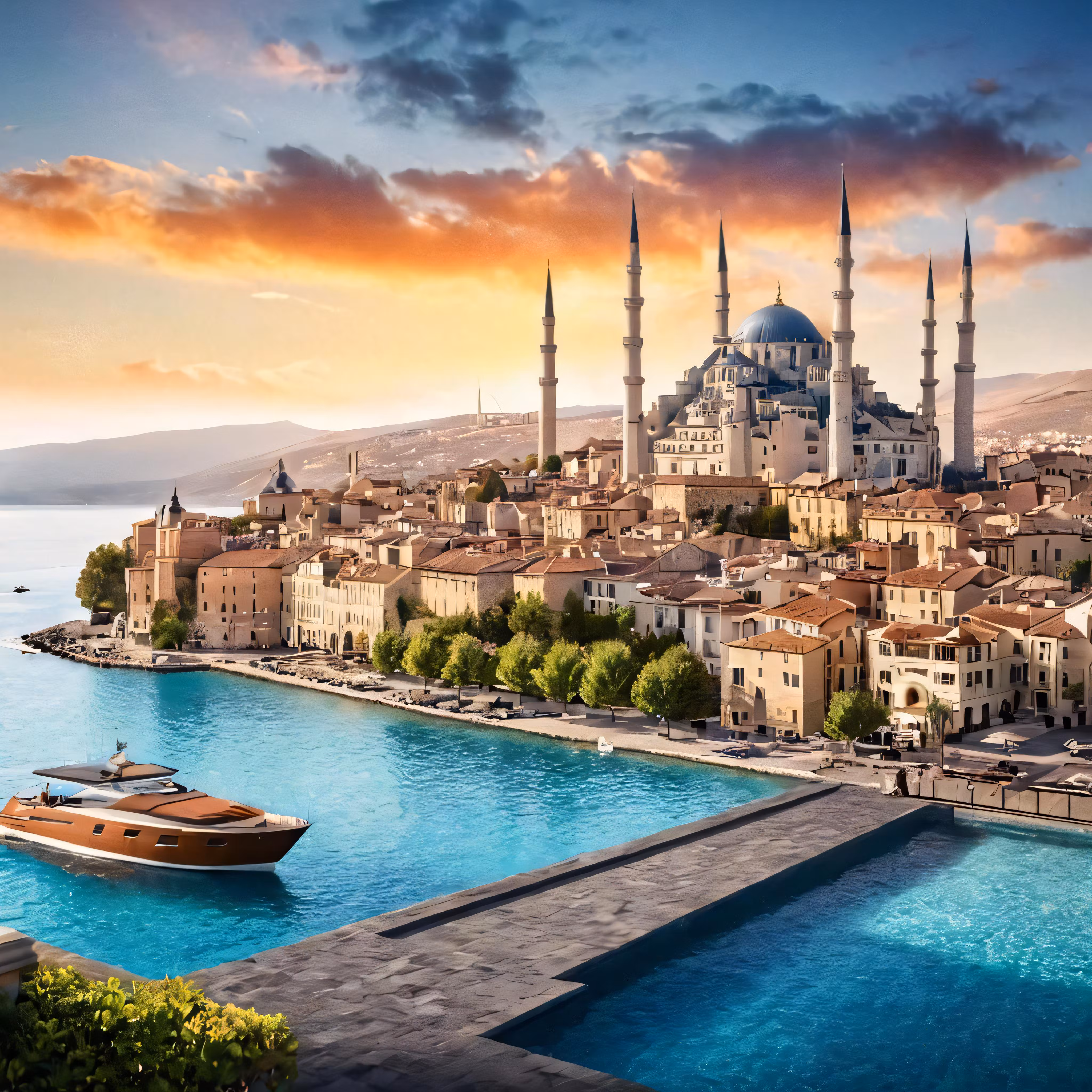 High resolution picture, free to use, a boat is parked in front of a city