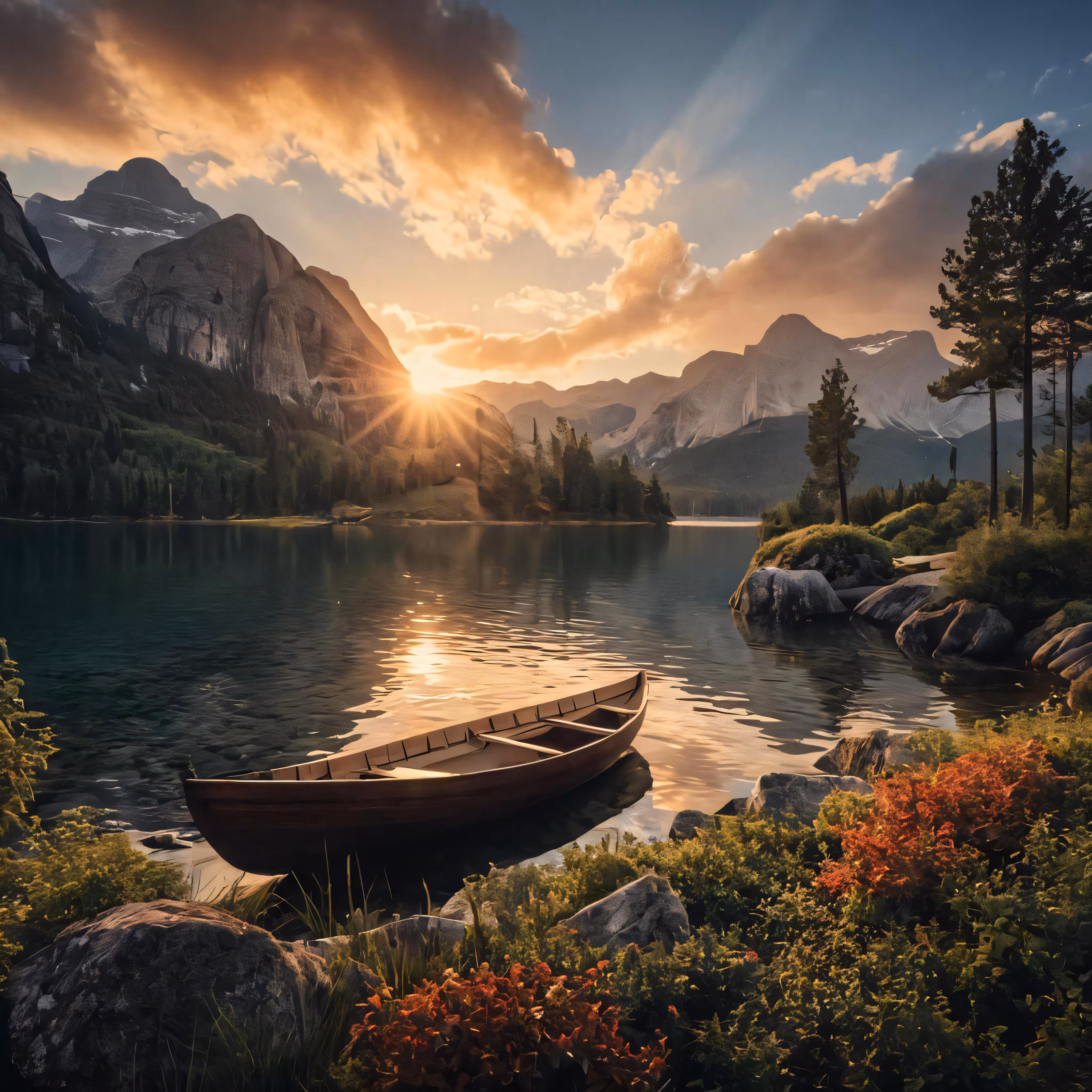 High resolution picture, free to use, a boat sitting on top of a lake near a mountain