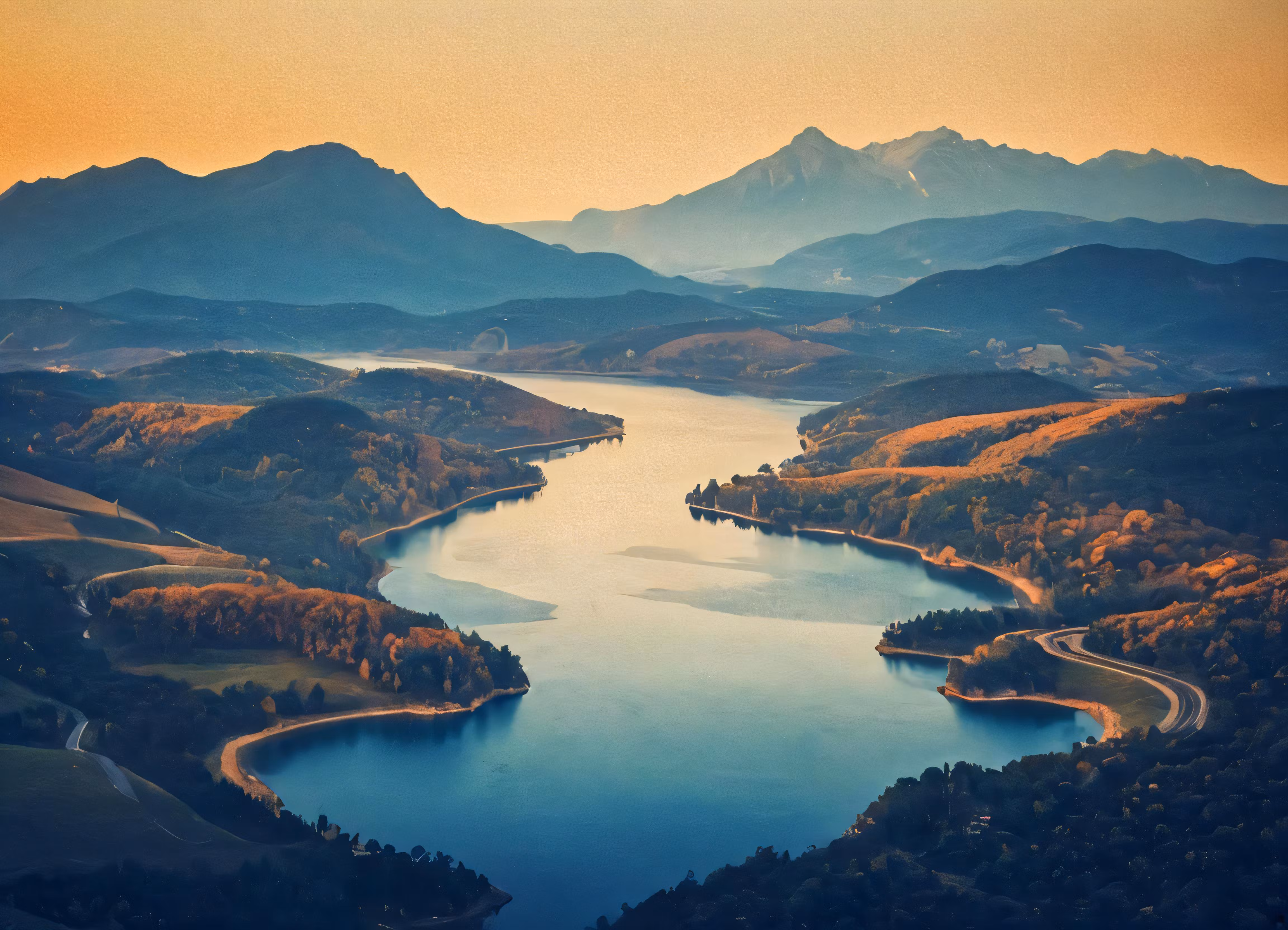 High resolution picture, free to use, a body of water surrounded by mountains in the sunset