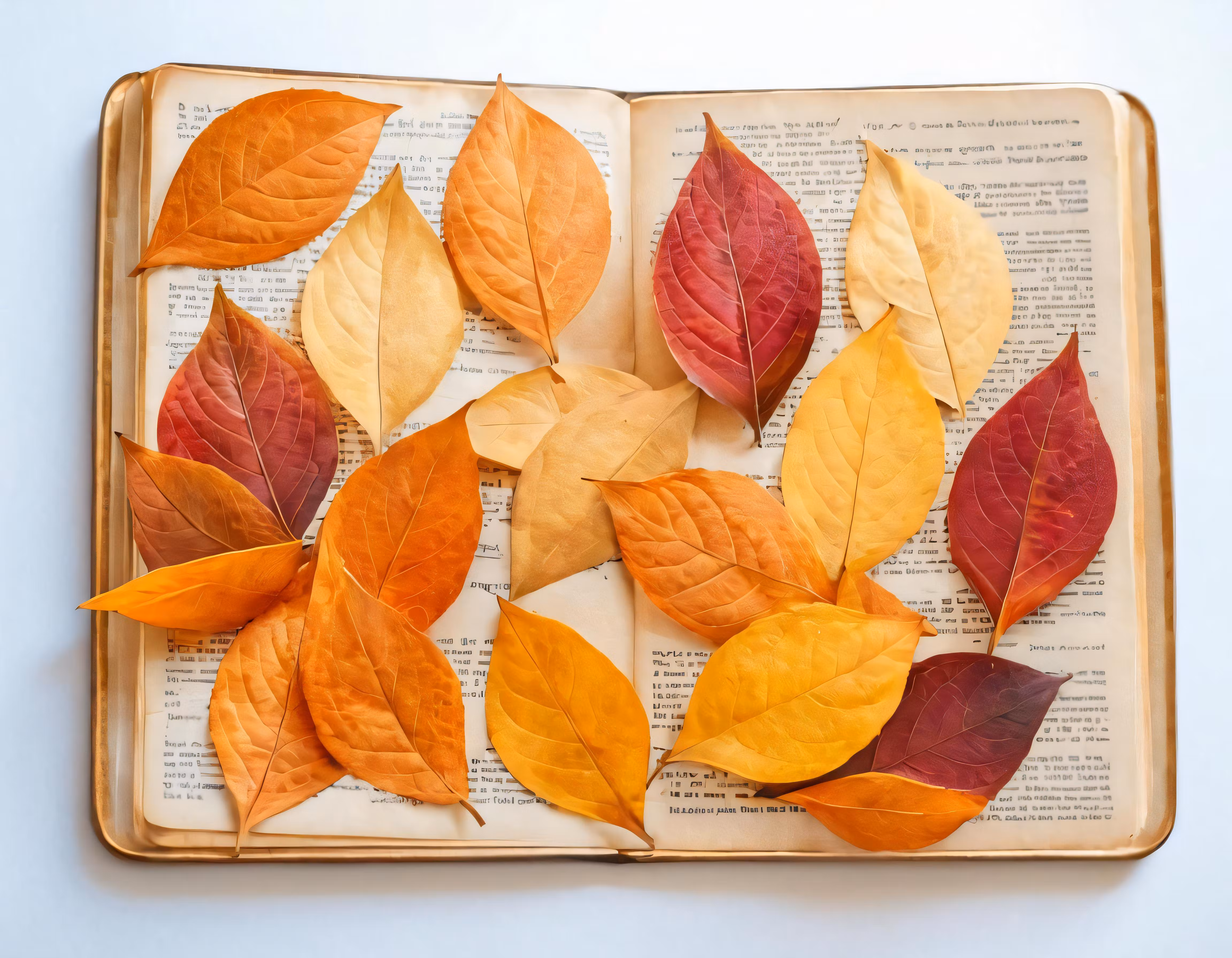 High resolution picture, free to use, a book with autumn leaves laying on it