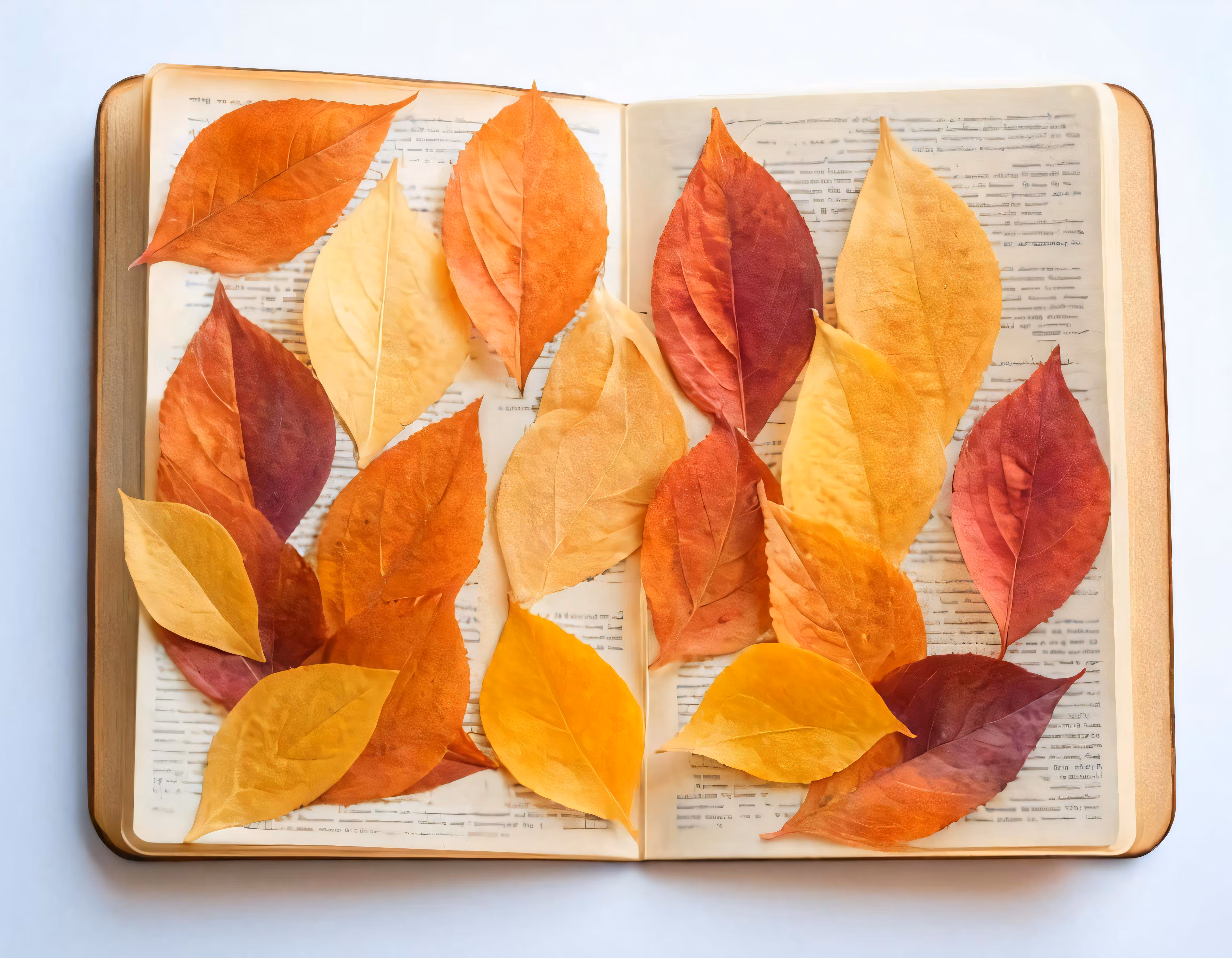 High resolution picture, free to use, a book with pages full of different color leaves on it