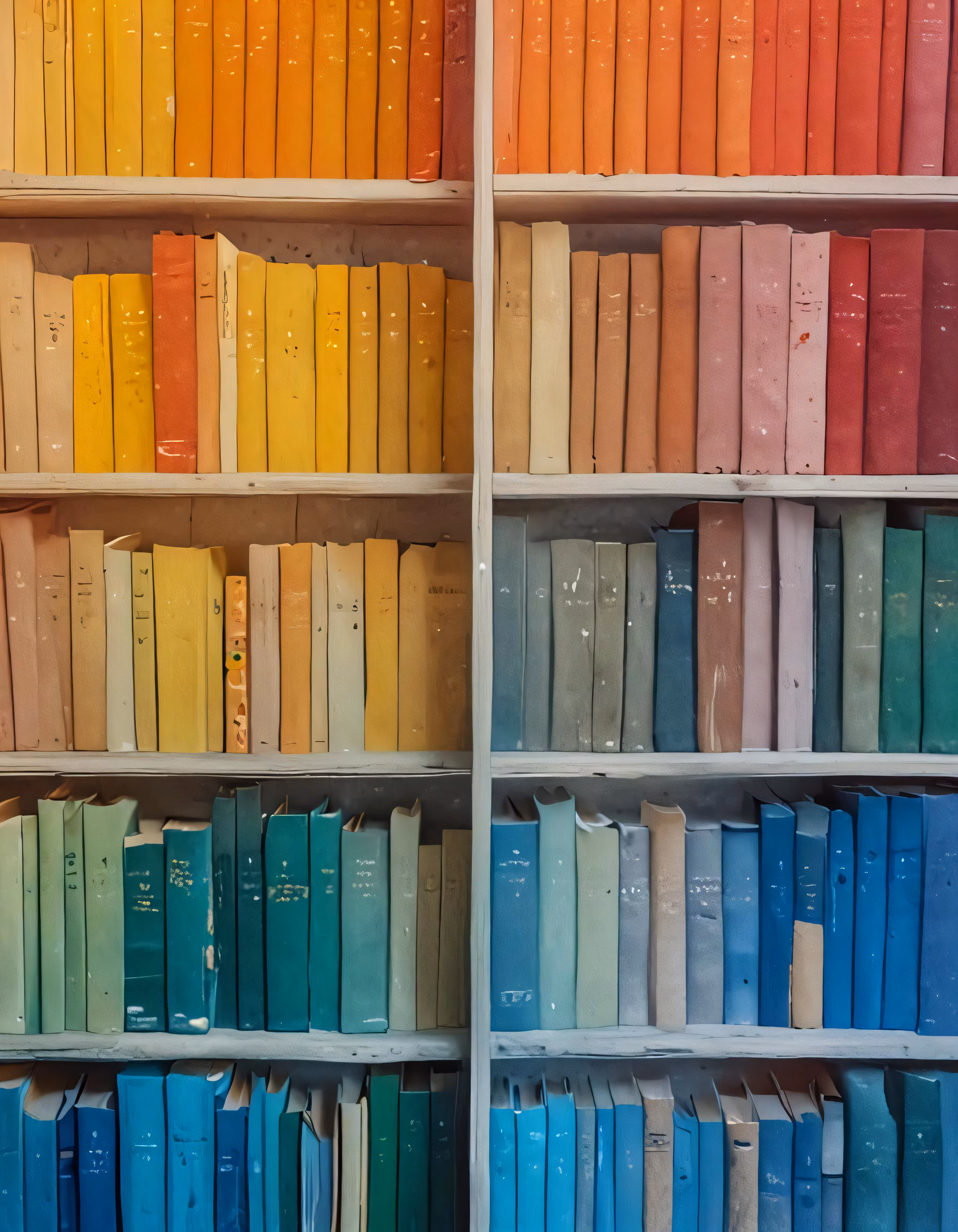 High resolution picture, free to use, a bookcase with rows of books in different colors
