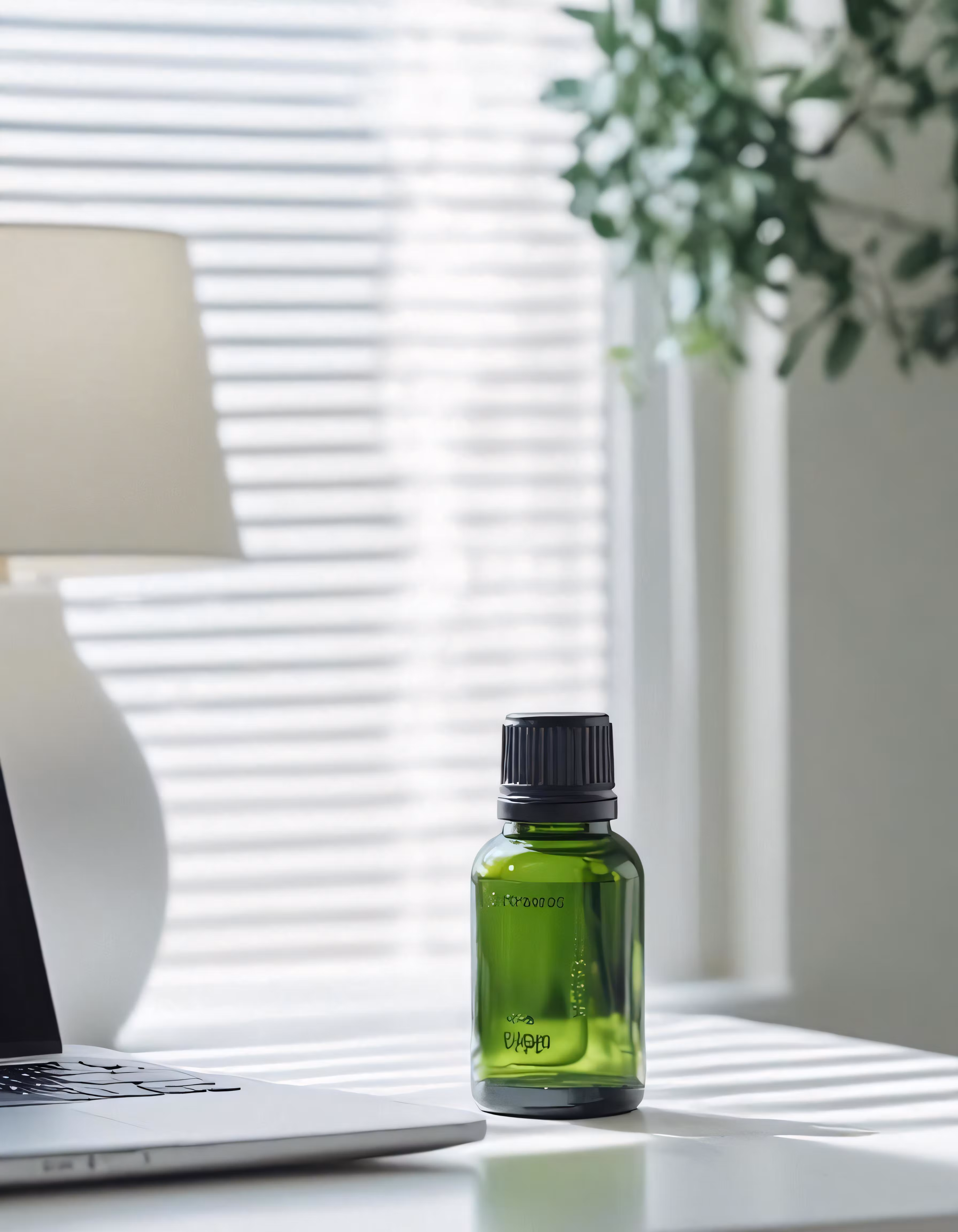High resolution picture, free to use, a bottle is sitting on a white desk next to a laptop