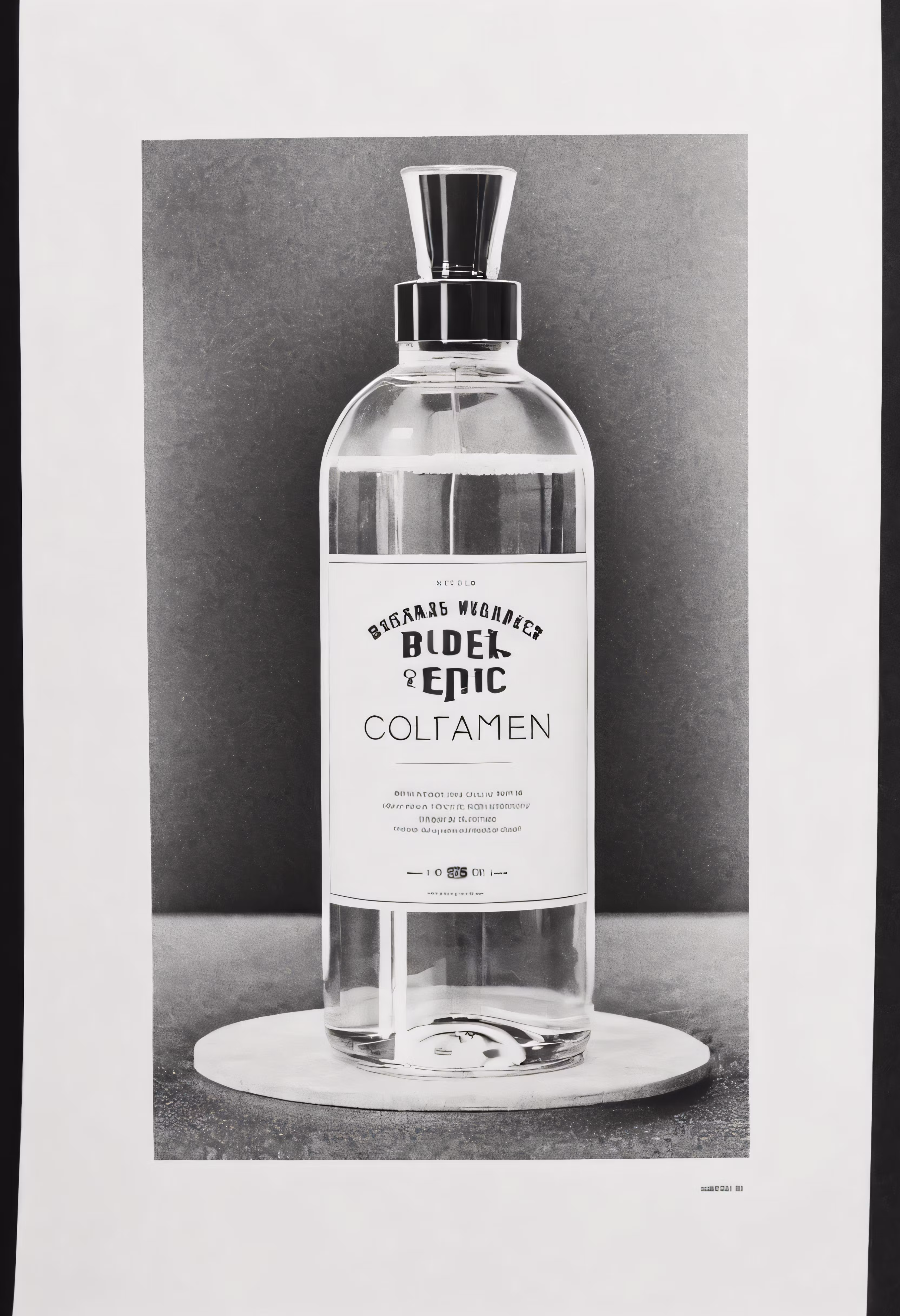 High resolution picture, free to use, a bottle of alcohol on a plate with a wall behind it