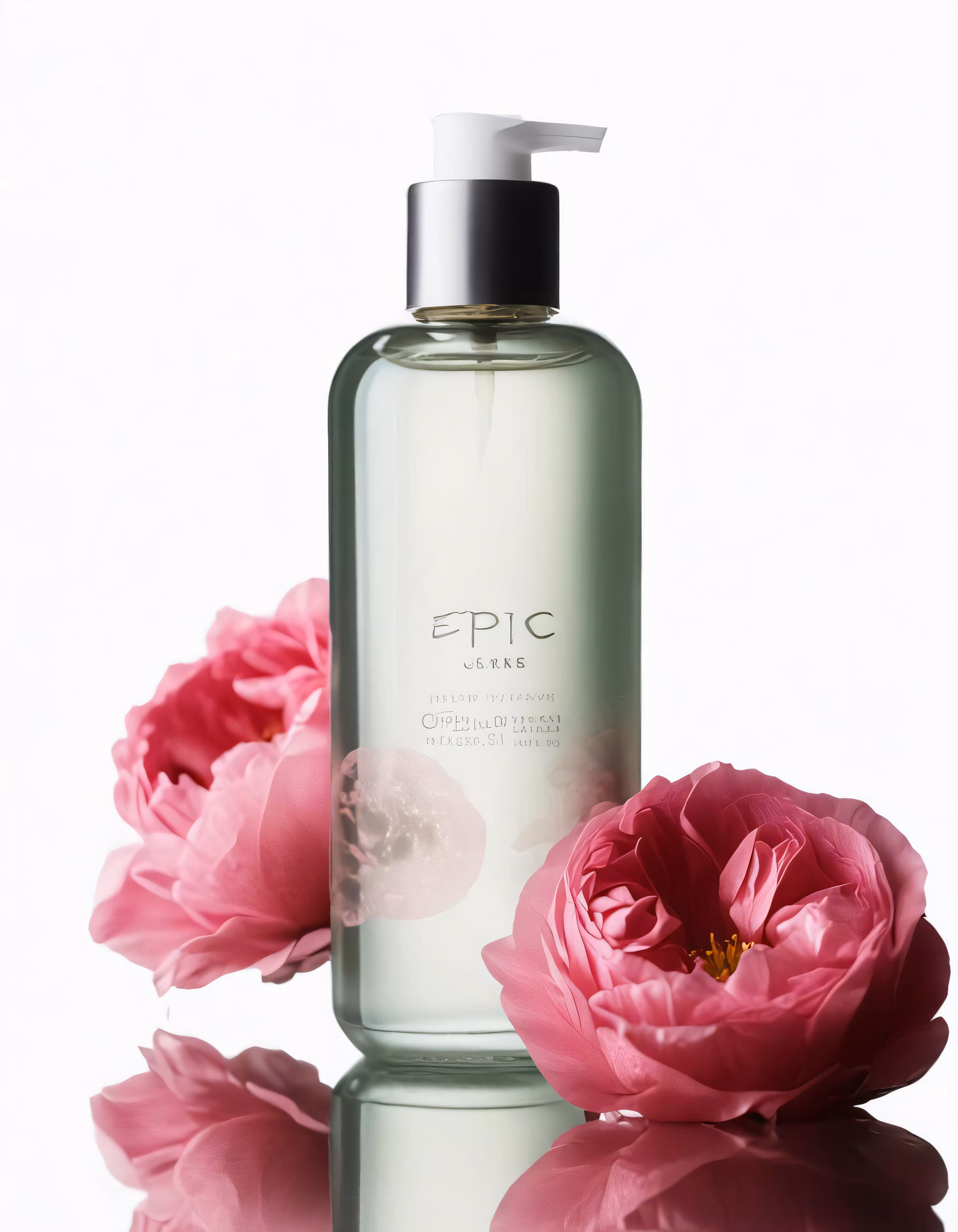 High resolution picture, free to use, a bottle of liquid with two flowers next to it