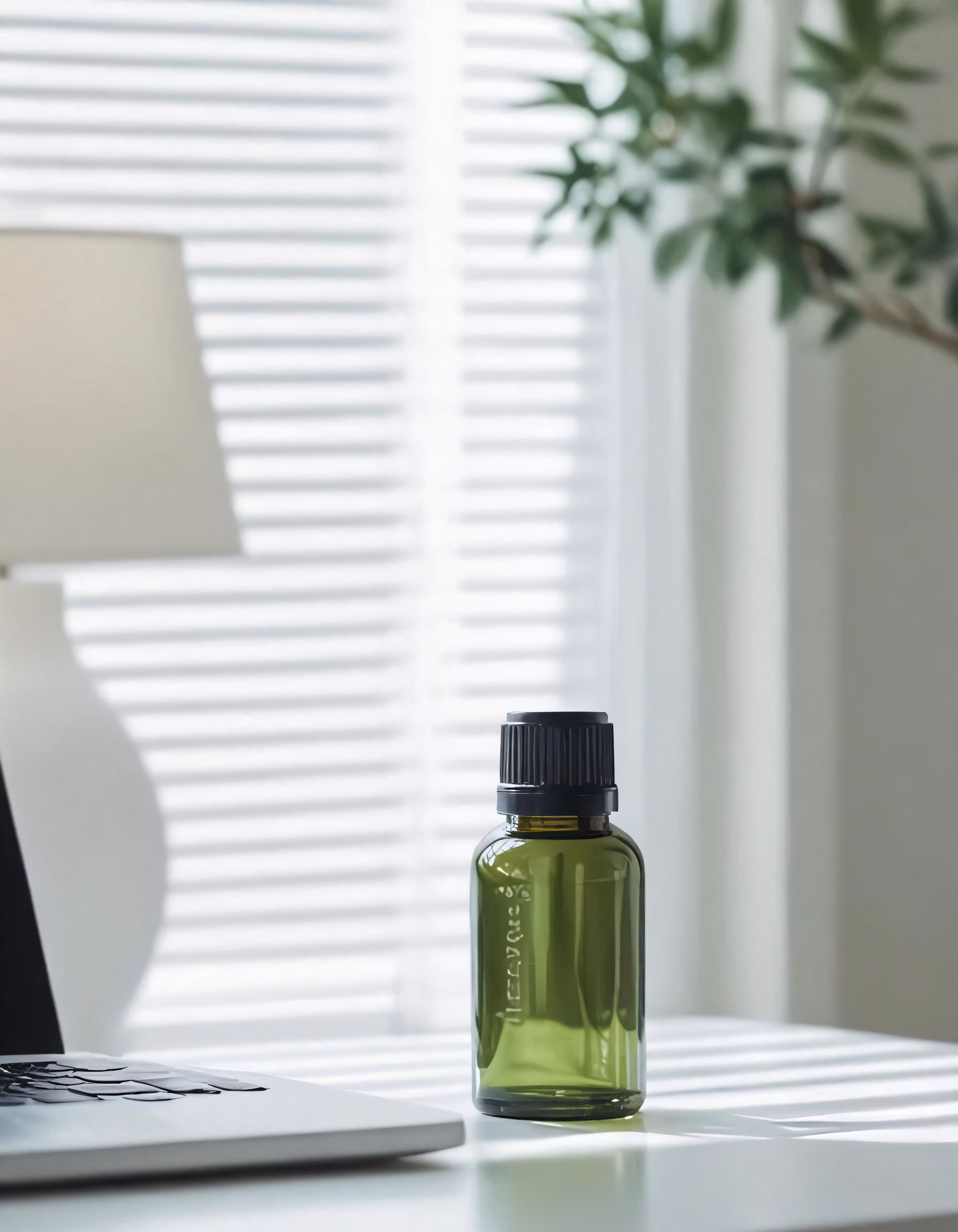 High resolution picture, free to use, a bottle sitting on a desk in front of a laptop