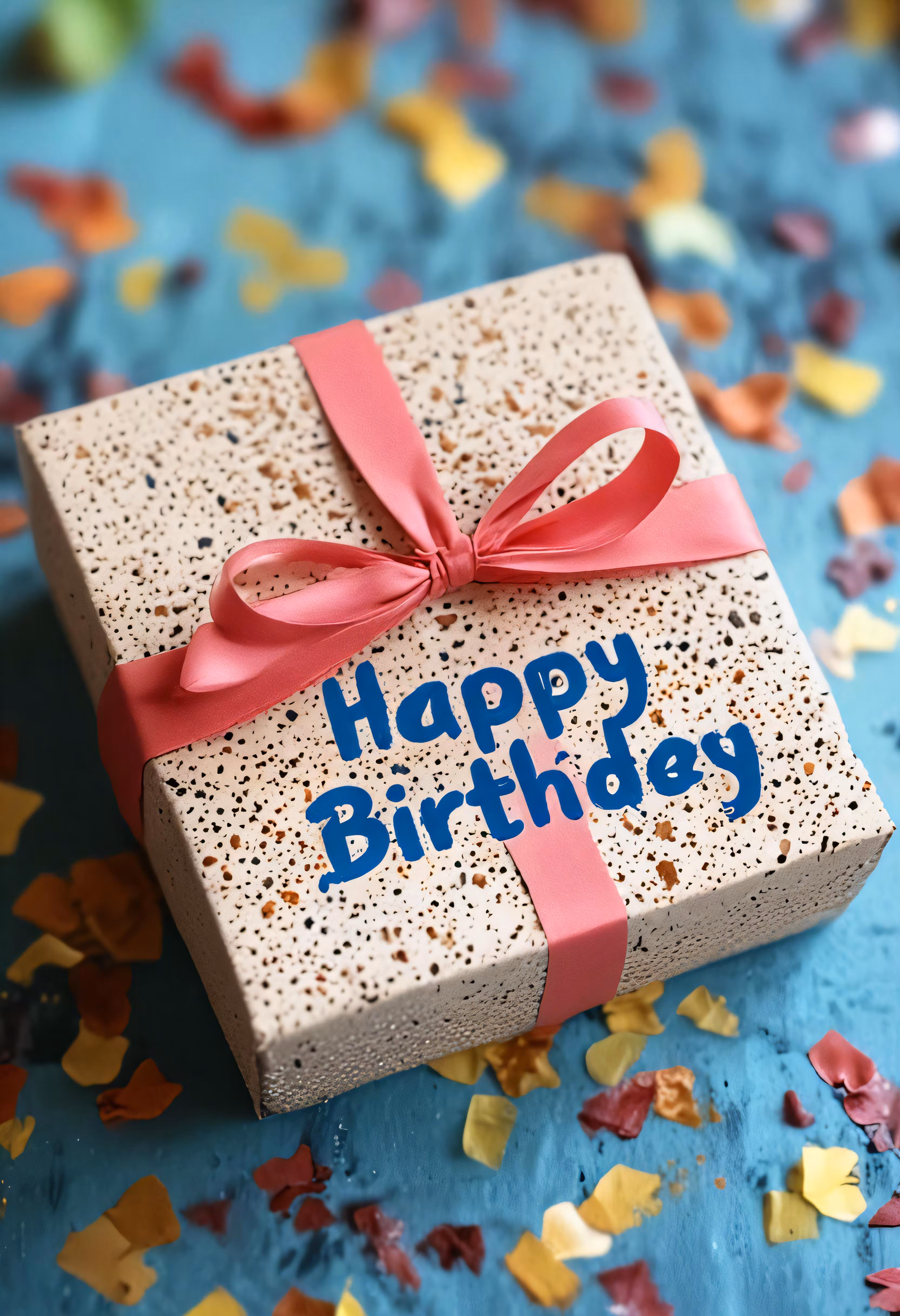 High resolution picture, free to use, a box with a happy birthday on it sitting on a bed of confetti